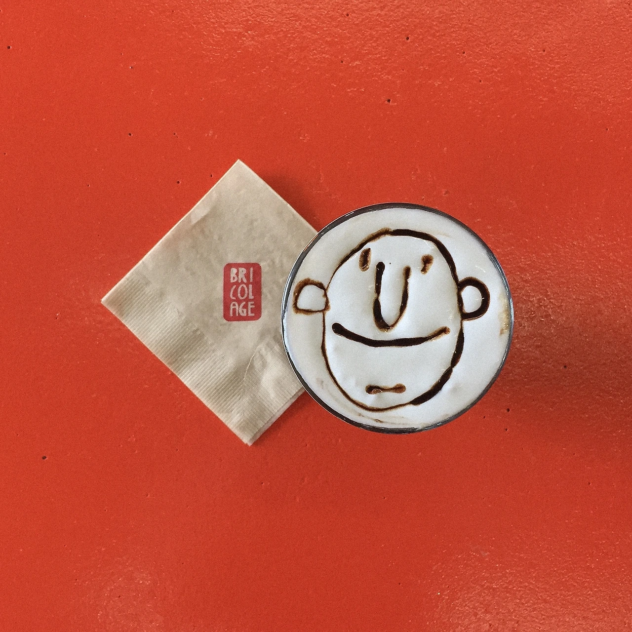 한 가지 어니언보다 마음에 들었던 점은 카페에 머물렀던 한 시간 남짓한 시간 사이에 '브리꼴라주'라는 브랜드가 강렬하게 뇌리에 박혔다는 점. 간판에도, 테이블에도, 포토스폿 장식에도 곳곳에 다홍색 글씨와 얼굴 그림 로고가 박혀있다. 심지어 내가 주문한 아인슈페너에도 캐릭터 얼굴이 웃고 있어, 잔을 비울 때까지 나와 눈을 마주친다. 잊지 못할 얼굴.