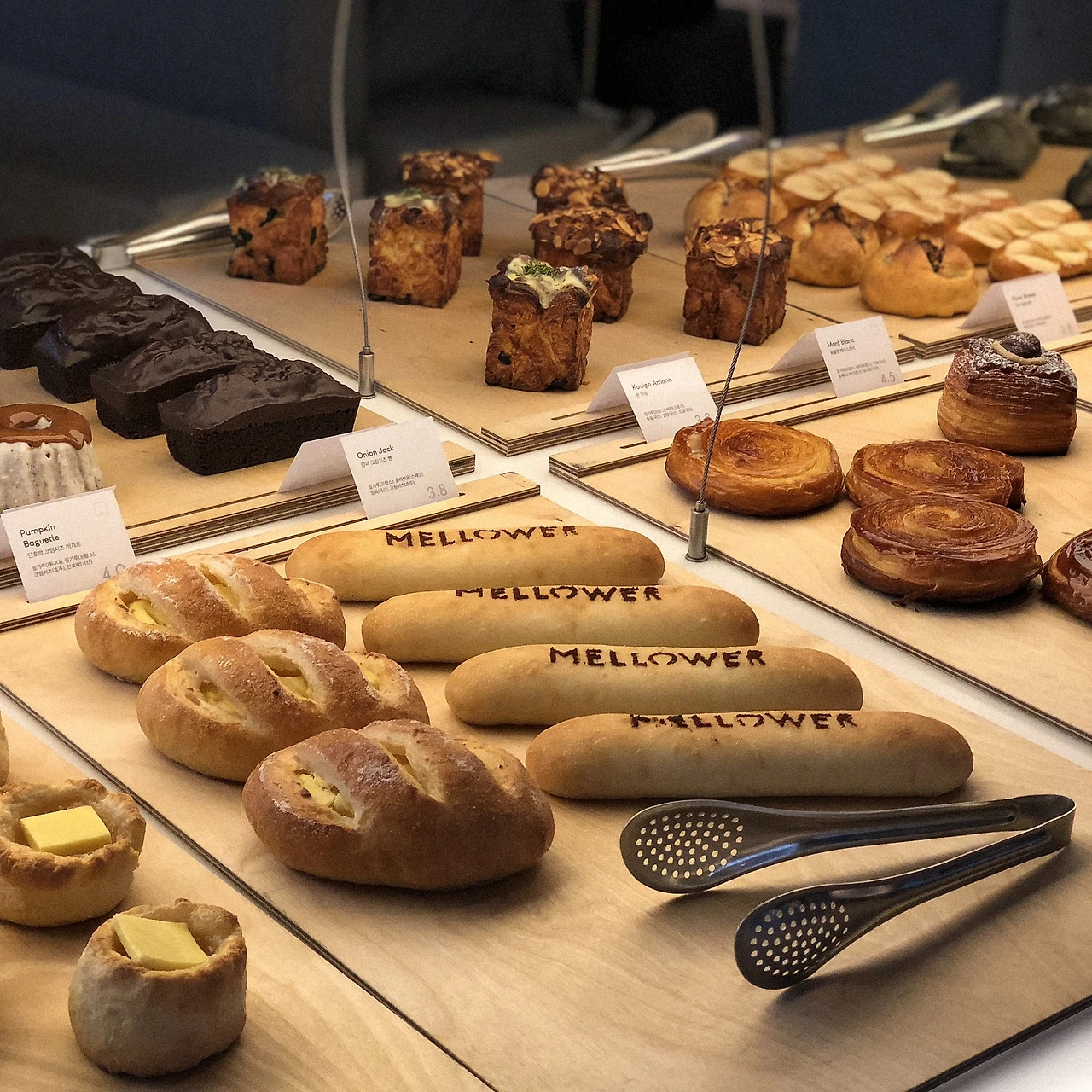 '빵 공장' 같은 곳. 들어가자마자 카페 한가운데 보이는 빵 진열대로 달려가게 되어 있다. 식빵부터 케익까지 종류가 다양해서 눈 돌아가고, 고소하고 달달한 냄새도 기가 막히고, 또 몇몇 빵 위에 'MELLOWER'라고 글씨가 새겨진 게 왜 이렇게 귀엽던지. 역시 빵은 보고만 있어도 기분 좋아지는 무언가가 있다. 먹으면 더 좋고.