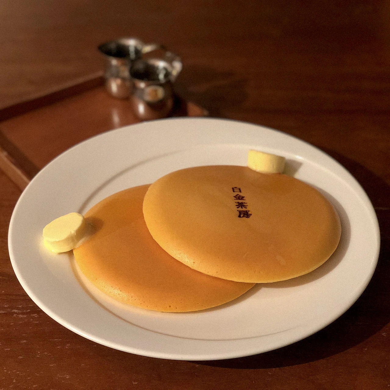 '白金茶房'이 새겨진 동그란 팬케이크 비주얼로 유명한 카페. 딸기나 크림 등 토핑이 올라간 메뉴도 있지만 팬케이크는 메이플 시럽 맛으로 먹는 거라고 생각하기 때문에 기본으로. 그리고 저녁이니 가벼운 스파클링 와인을 곁들였다.