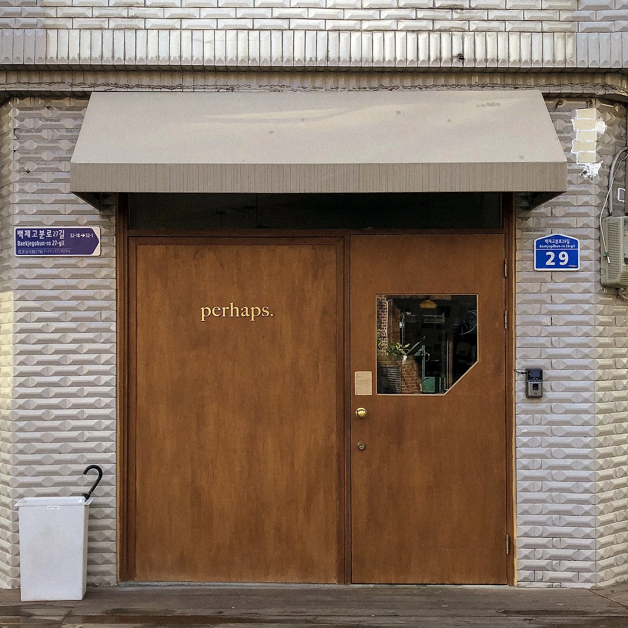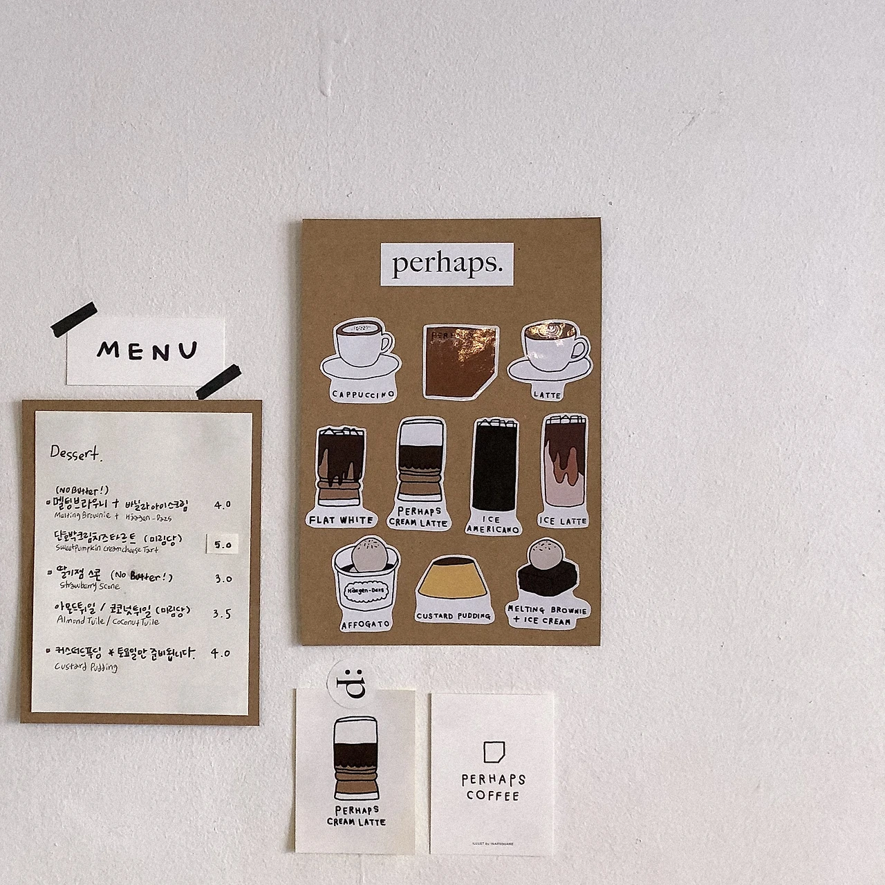 요즘 인기라는 송리단길 카페가 대부분 석촌호수 동호 쪽에 몰려 있는데 특이하게 서호 쪽 골목에 있는 퍼햅스. 딱 두 가지 포인트가 인상적이었다. 하나는 이 가게의 간판이자 대문. 나무로 만든 문에 'perhaps'라고 썼을 뿐인데 저게 뭐라고 예쁜지. 최고의 포토스팟. 두 번째는 메뉴판과 벽 곳곳에 붙어있던 메뉴 스티커. 저 스티커를 굿즈로도 팔던데 탐났지만.. 2개에 1000원 정도 가격으로 골라 살 수 있었다면 질렀을 거다.