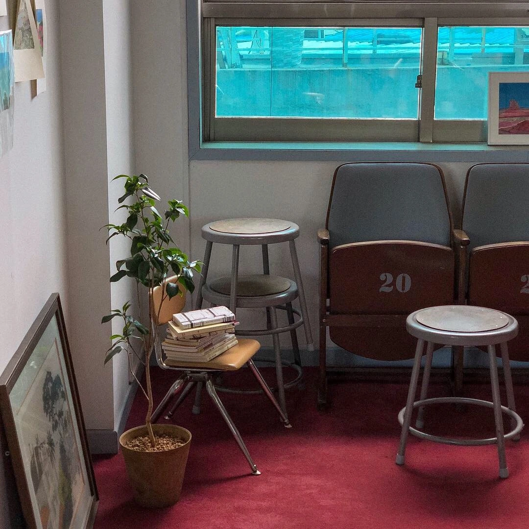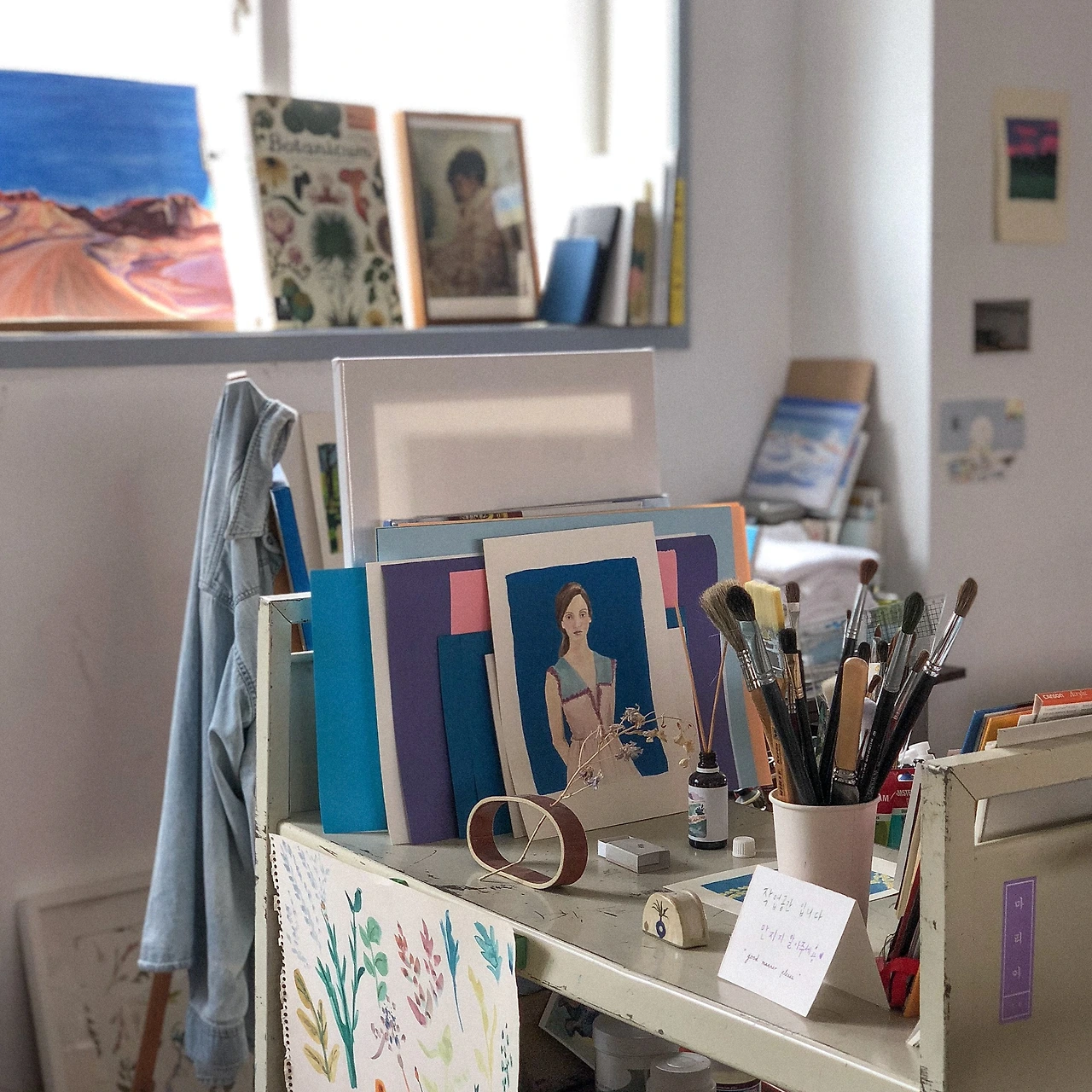 커피를 하는 커피사와 그림을 그리는 화가 마리아가 함께 쓰는 작업실. 군데군데 직접 그리신 작품이 무심한 듯 시크하게 전시되어 있고, 실제로 사용하시는 물감과 붓, 스케치북도 툭툭 놓여있다. 실제로 작업하시는 모습을 본 건 아니지만 누군가의 작업 공간을 구경했다는 것만으로도 예술적 영감이 조금이나마 충전된 듯한 느낌.