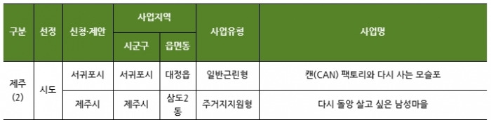 사업 선정시에는 특정지역에 사업이 집중되지 않도록 지역 간 형평성을 고려하는 한편, 지역규모 및 사업준비 정도 등을 종합적으로 감안해 시·도별 최대 9곳, 최저 2곳 등 골고루 선정했으며, 농산어촌지역(읍·면)도 23곳을 선정해 다양한 지역에서 사업이 추진되도록 했다.