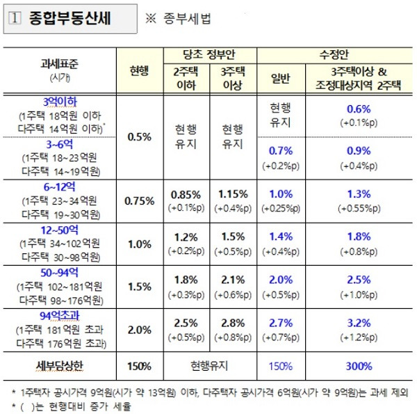 이번 부동산 대책의 핵심은 종합부동산세로 정부가 지난달 31일 국회에 제출한 종부세법 개정안에서 3억 원을 초과하는 고가주택 보유자에게 부과하는 종부세 최고세율을 기준 2.5%에서 3.2%까지 인상하기로 했다.