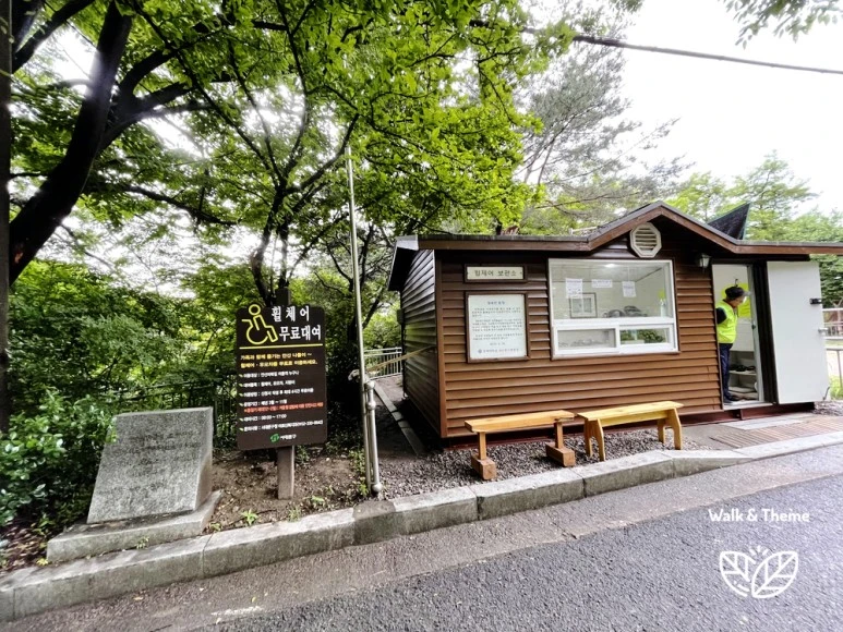 출발지로 다시 내려가는 길에 휠체어무료대여소(휠체어, 유모차, 지팡이 대여)를 만났어요.