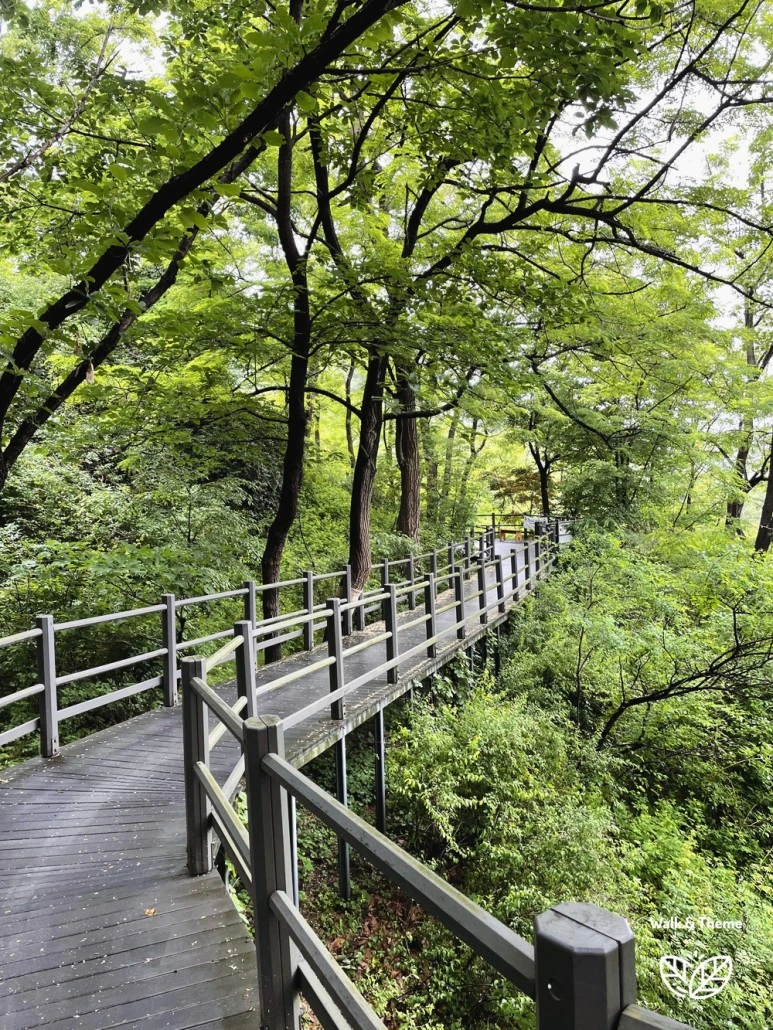안산자락길은 전 구간이 사진과 같이 계단이 없는 완만한 경사로와 나무데크로 이루어져 있어 무장애 여행이 가능한 곳입니다. 남녀노소는 물론 휠체어, 유모차도 어려움 없이 돌아볼 수 있어요.