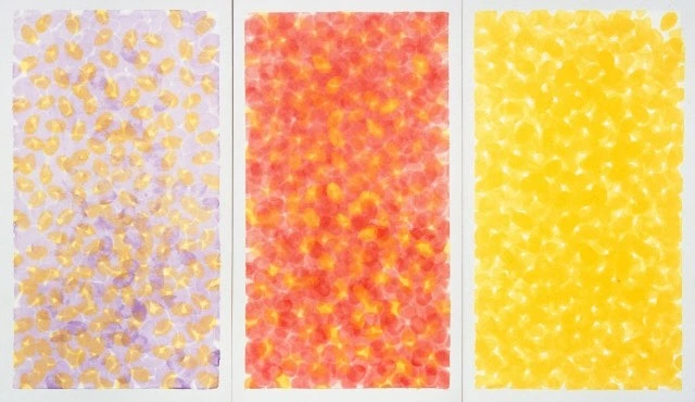 한지에 찍힌 수백개의 점들은 비슷한 맑은 톤인데, 절묘하게도 마치 그림 뒤에서 빛이 새어나오는듯한 인상을 준다. 어두운 색의 점뒤로 찍힌 맑은 노랑색 계열의 점들 때문이다.