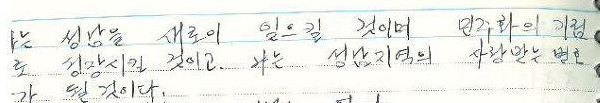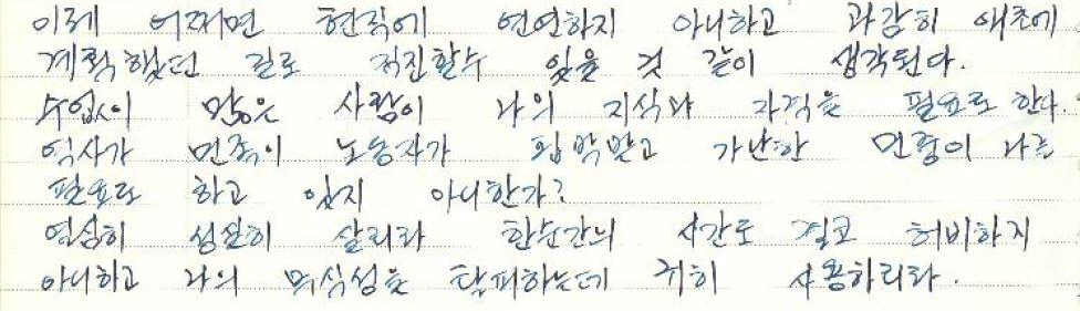 수없이 많은 사람이 나의 지식과 자격을 필요로 한다. 역사가 민족이 노동자가 핍박받고 가난한 민중이 나를 필요로 하고 있지 아니한가? 열심히 성실히 살리라. 한순간의 시간도 결코 허비하지 아니하고 나의 무식성을 탈피하는 데 귀히 사용하리라. 1987-07-14