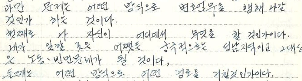 그로부터 10년이 흘렀습니다. 마지막 일기가 쓰인 1989년의 이재명은 사법고시에 합격하여 사법연수원 수료를 앞두고 있습니다. 판검사가 될 수 있을 만큼 좋은 성적을 얻었음에도 불구하고, 성남의 가난하고 억울한 노동자들을 돕는 변호사가 되겠노라며 결심을 다잡는 글로 일기는 끝을 맺고 있습니다.
