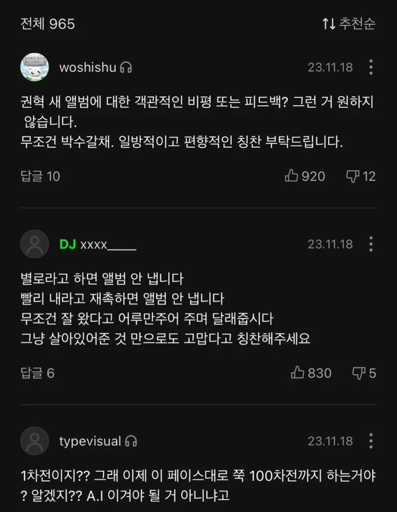 3. 사람들의 반응도 너무 재밌다. "별로라고 하면 앨범 안 냅니다. 빨리 내라고 재촉하면 앨범 안 냅니다. 무조건 잘 왔다고 어루만주어 주며 달래줍시다. 그냥 살아있어준 것만으로도 고맙다고 칭찬해주세요" 댓글에서 딘은 금쪽이가 되어 있었다. 이번 싱글만 내고 사라질까 봐, 다들 딘을 보호하고 격려했다.