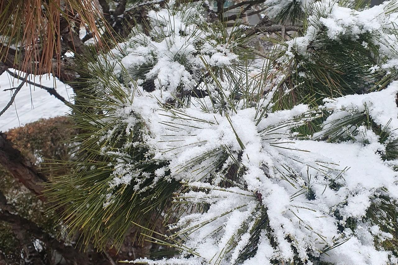 폭설은 아니지만 나뭇가지에 살포시 내려앉은 새하얀 눈이 예쁘다.