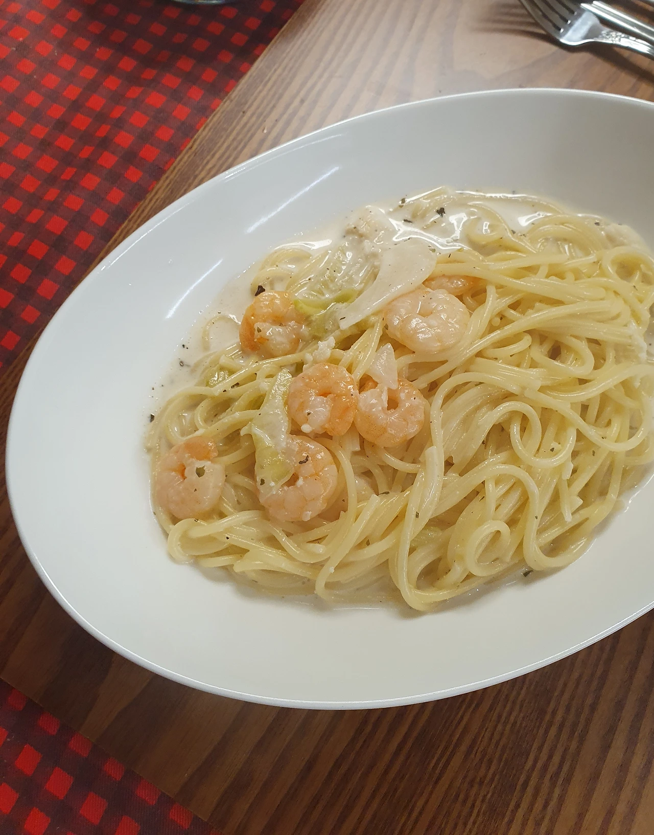 새우 듬뿍 넣고 양파와 셀러리 넣은 스파게티.