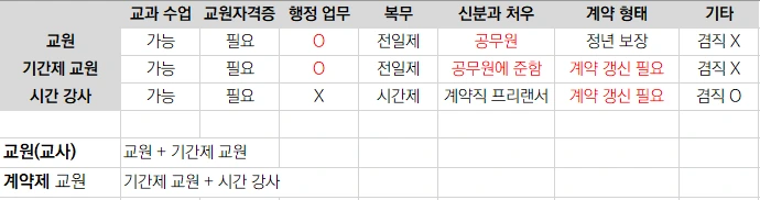 먼저 기간제와 시간 강사 설명하겠다. 학교에 근무하는 '선생님'은 세 종류로 분류된다. 교사, 기간제 교사, 강사 세 종류다. 교사와 기간제 교사는 교원으로 묶이고 강사는 교원은 아니다. 강사는 공무원 연금을 내지 않고 프리랜서 세금 3.3%를 떼이며, 교사가 아니기에 과외나 학원 강사를 겸직해도 문제가 없다.