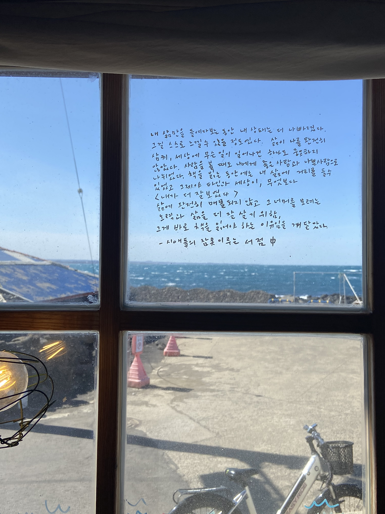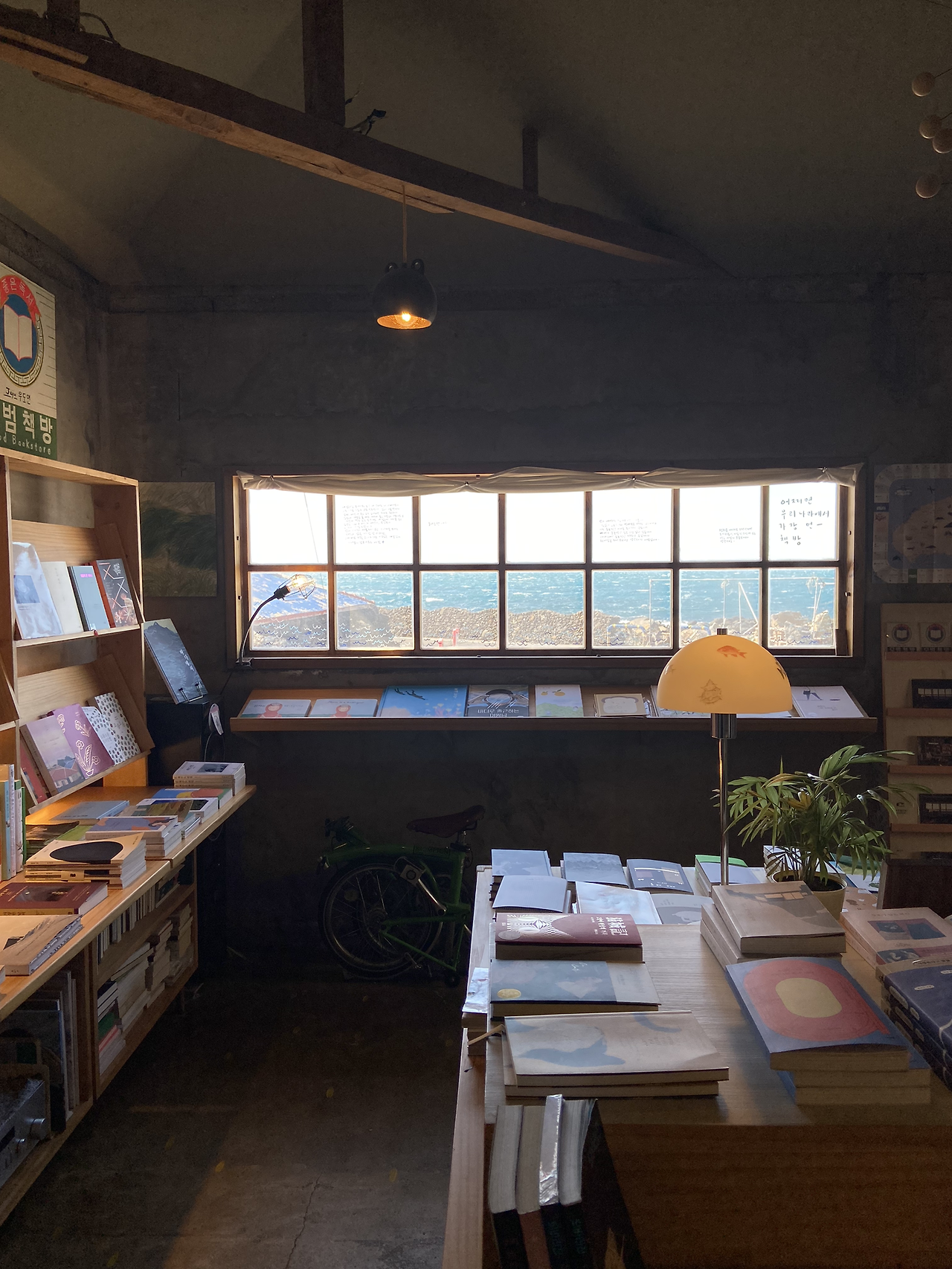 창 밖으로 보이는 우도 바다. 구석구석 눈에 담고 싶은 책방, 내가 좋아하는 책방. 이미 인기 많은 우도이지만, 밤수지맨드라미만으로 우도에 올 이유는 충분하다.
