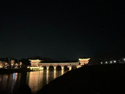 서울에서 출발할 땐 여름인가 싶을 만큼 더웠지만 경주의 밤은 약간 쌀쌀할 정도로 선선했다. 시원한 공기를 즐기며 10분 쯤 걸으니 월정교가 나온다. 월정교는 760년(경덕왕19년)에 지어진 다리로, 통일신라의 육조 거리라는 별명을 지녔다. 물론 복원한 것이긴 하지만 기록에 근거했으니 분명 그때도 엄청 아름다웠으리라. 태종무열왕 김춘추의 딸 요석공주와 원효대사 해골물의 사랑 이야기가 묻어있는 곳이기도 하다. 다리에서 떨어져 젖은 원효가 옷을 말리겠다는 핑계로 요석궁을 찾아 사랑을 나누었다나 뭐라나. 하여간 파계승... 그러나 이 사이에서 태어난 설총은 또 한자의 음훈으로 우리말을 표기할 수 있도록 한 이두 문자를 고안했으니 잘 한 것 같기도 하고? 그 옛날에도 이런 다리였다면 없던 사랑도 꽃피게 생겼다.