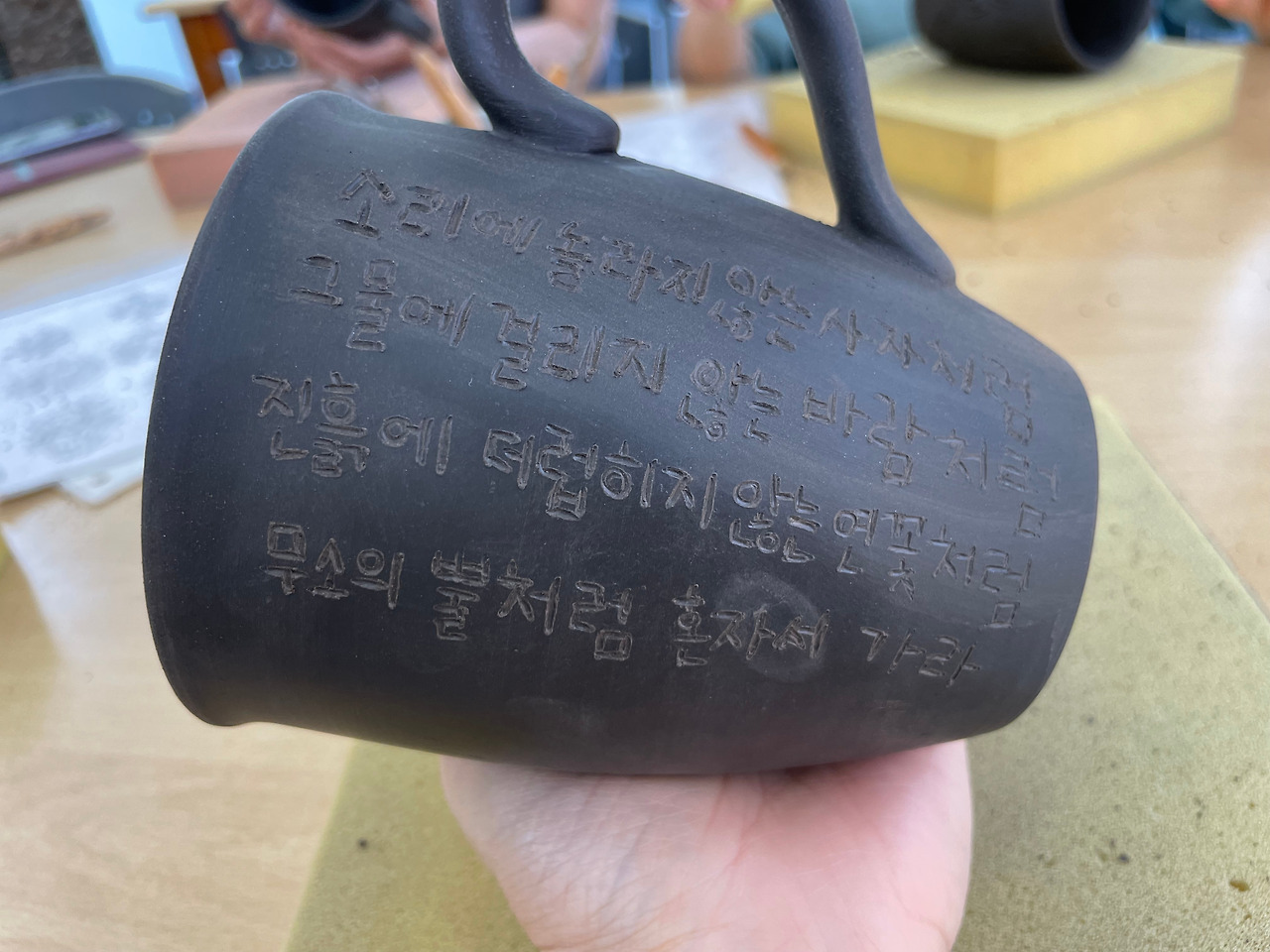 청자 머그컵 만들기 체험도 있었다. 모르고 온 거라 시간대가 안 맞았는데, 그냥 하라고 해 주셨다. 이런 온정... 안그래도 남도에 가지고 있던 좋은 편견이 한층 강화된다! 빚어놓은 도기가 마르기 전 문양이나 글씨를 새기면 구워서 보내준다고 했다. 다들 솜씨를 발휘하기 시작했다. 그러나 그림엔 영 소질 없는 나는 그냥 좋아하는 문장을 썼다.