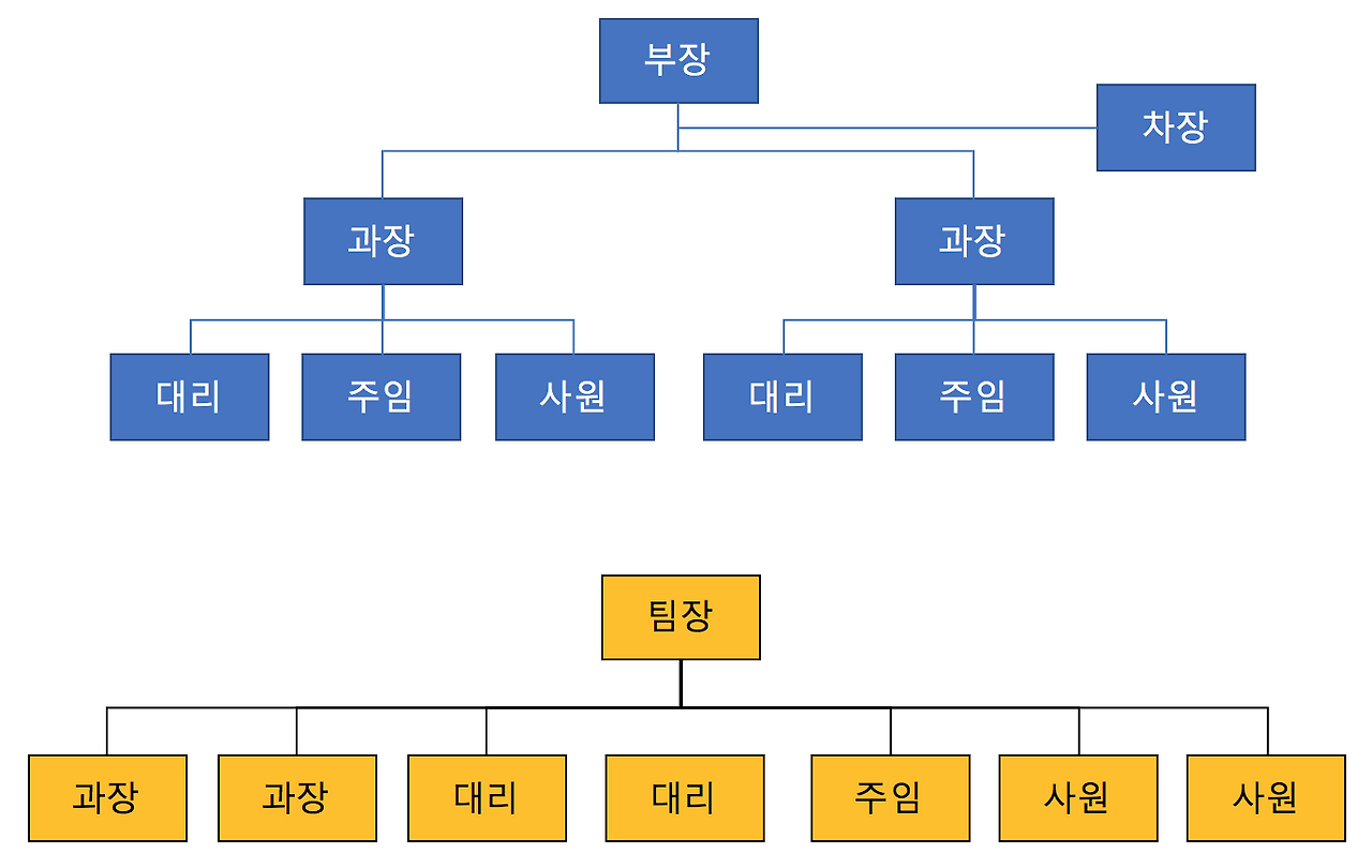 1편에 이어 부서 조직이 팀제 조직으로 변하는 모습을 살펴보겠습니다. 아래 그림을 참고해주십시오.