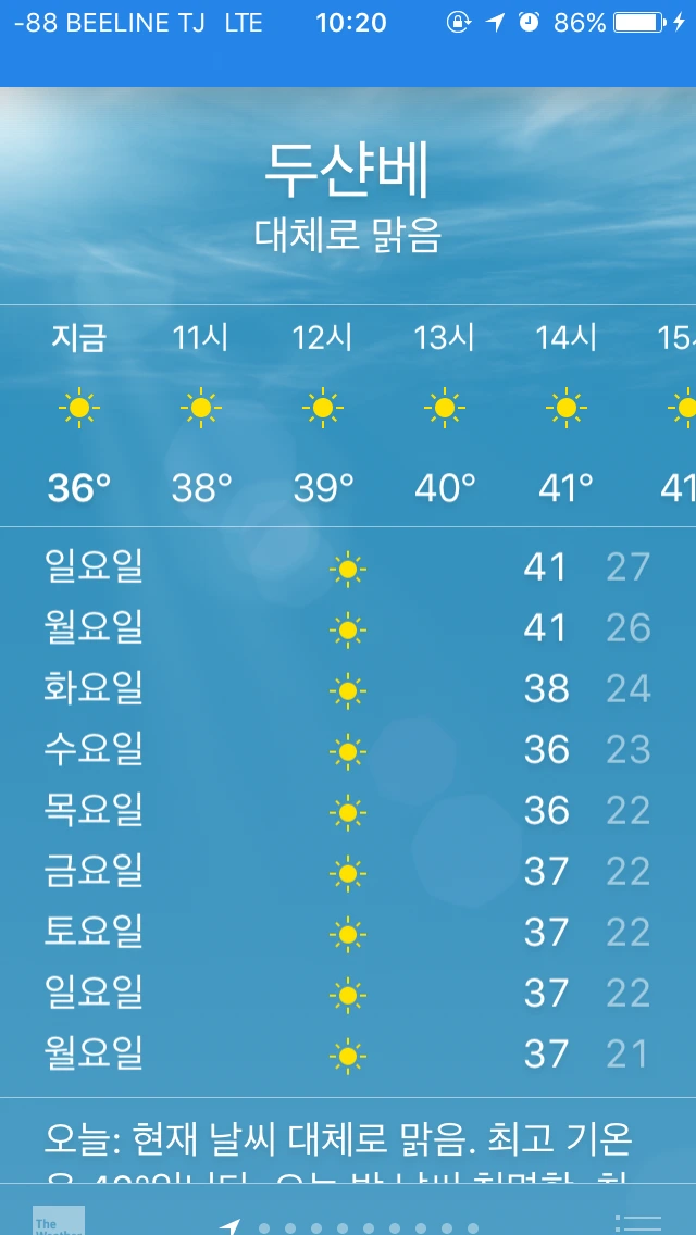 안타깝게도 두샨베에선 별로 볼 게 없습니다. 주요한 관광지로 박물관, 공원 등이 검색되더군요. 관광이 목적도 아니라 멀리 나가는 건 금세 접었습니다. 가까운 곳도 최소 2~3시간이 소요될뿐더러, 도로 사정이 좋지 않아서 여정이 쉽지 않습니다. 여담입니다만 가나 출장 시 짬을 내 갔던 Boti Fall 여정에서 쿵쾅거리던 차량 때문에 저는 허리 통증을 얻었지요. ㅜㅜ 한가로운 관광을 두렵게 만드는 또 하나의 이유는 엄청난 기온입니다. 다행히(?) 습도가 낮아서 한국처럼 꿉꿉하진 않습니다만, 햇볕이 정말 따갑습니다.