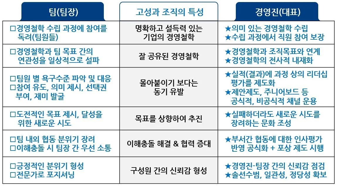 - 잘 공유된 경영철학 : 팀장은 경영진 오더를 실행할 소대장 같은 역할을 맡게 됩니다. 경영철학을 표현한 구호를 회의 시작에 앞서 외치는 것도 좋은 방법입니다. 20세기 CEO 명장, GE 잭 웰치는 '적어도 일곱 번은 말해야 직원들이 인지한다'라고 했습니다. 일곱 번을 말하게 하는 게 더 효과적일 것 같습니다.