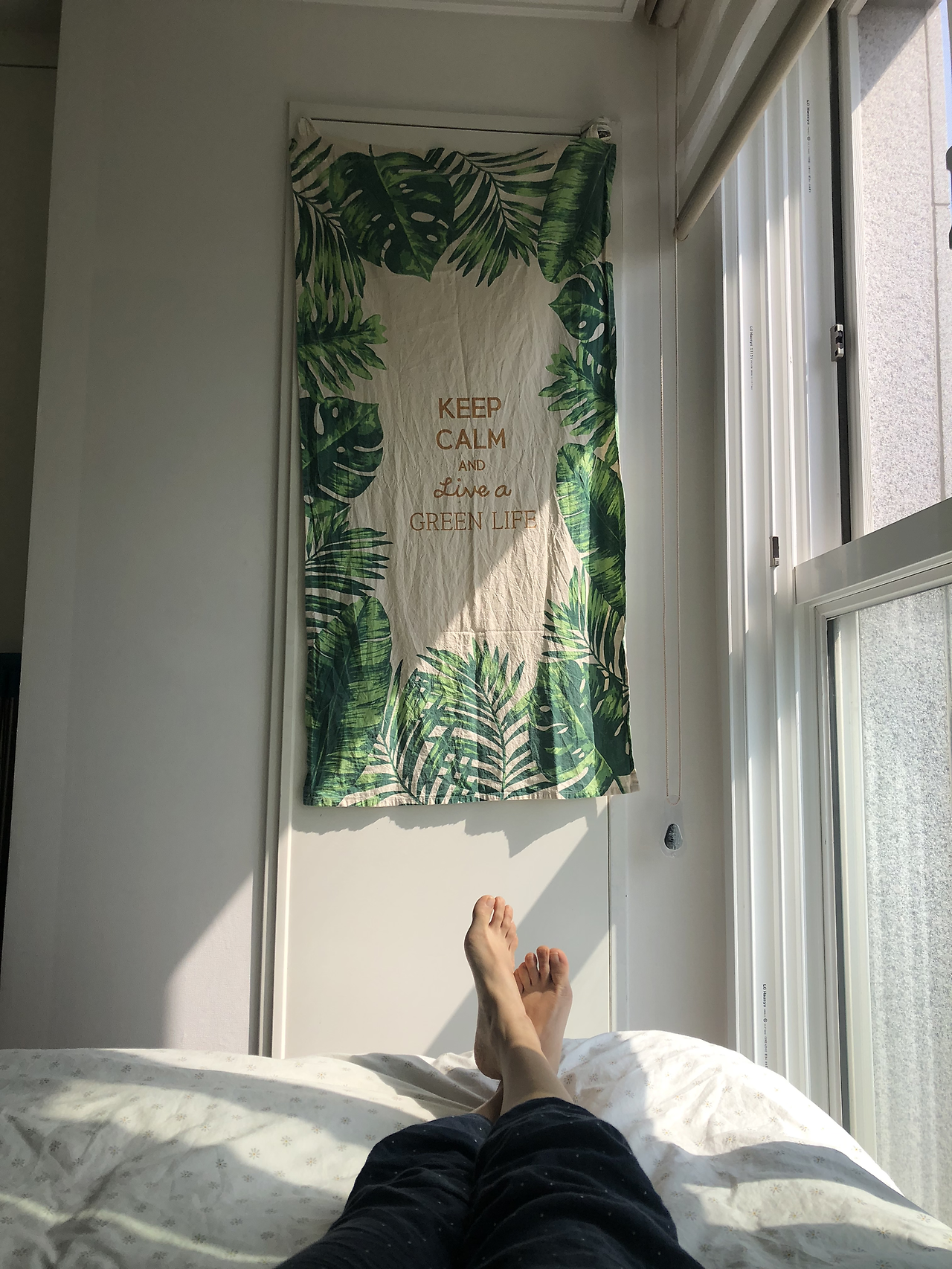 아침에 눈을 뜨니 봄햇살이 침대에 내려앉았다.