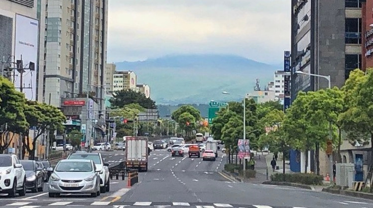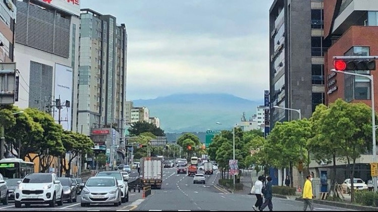 잿빛 하늘과 상반 되게 한라산의 허리는 초록으로 빛났다.