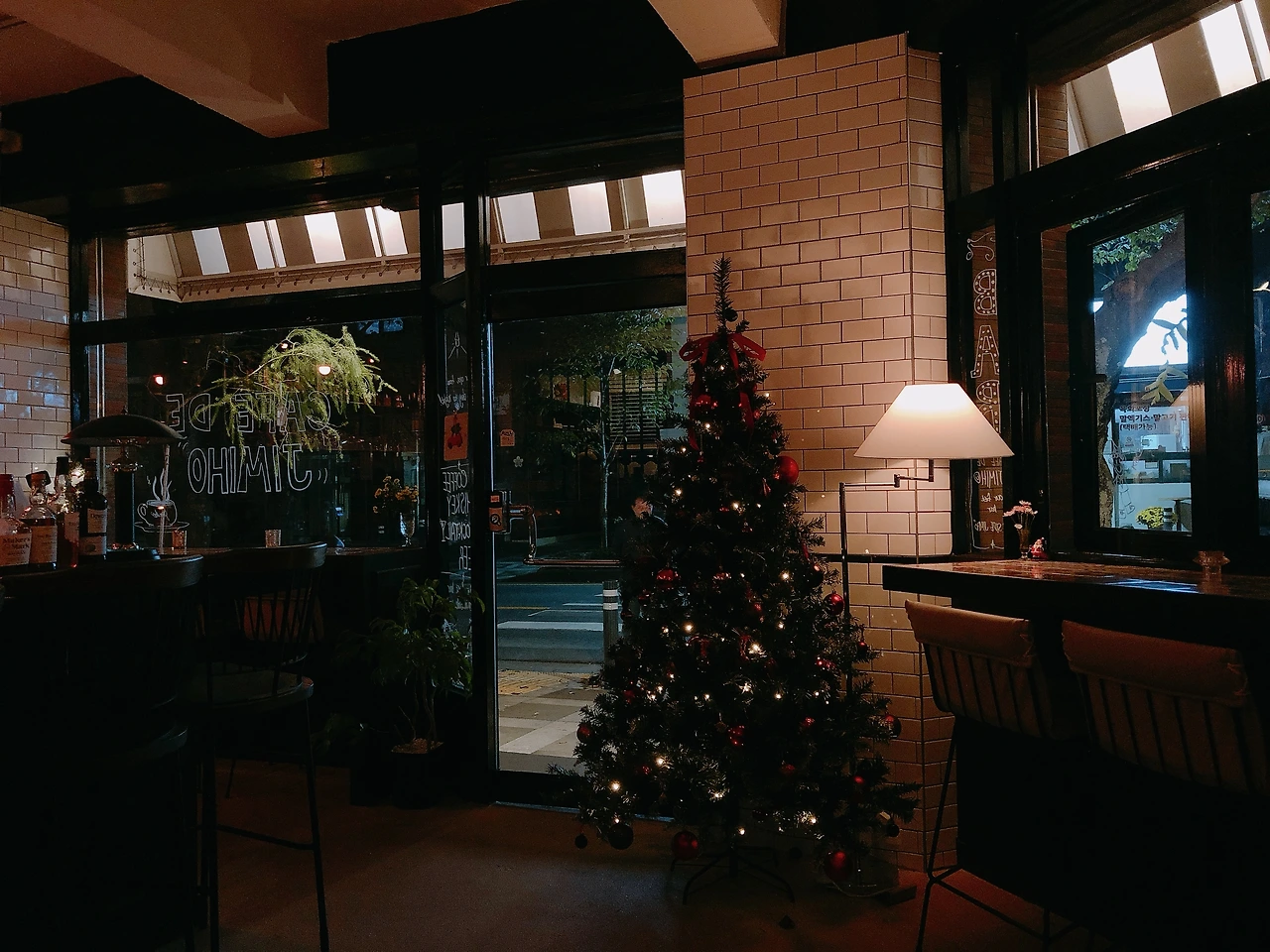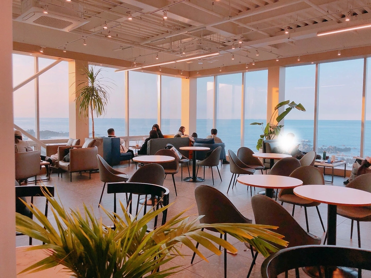 창가자리에 앉아 여행객들의 사진놀이 구경