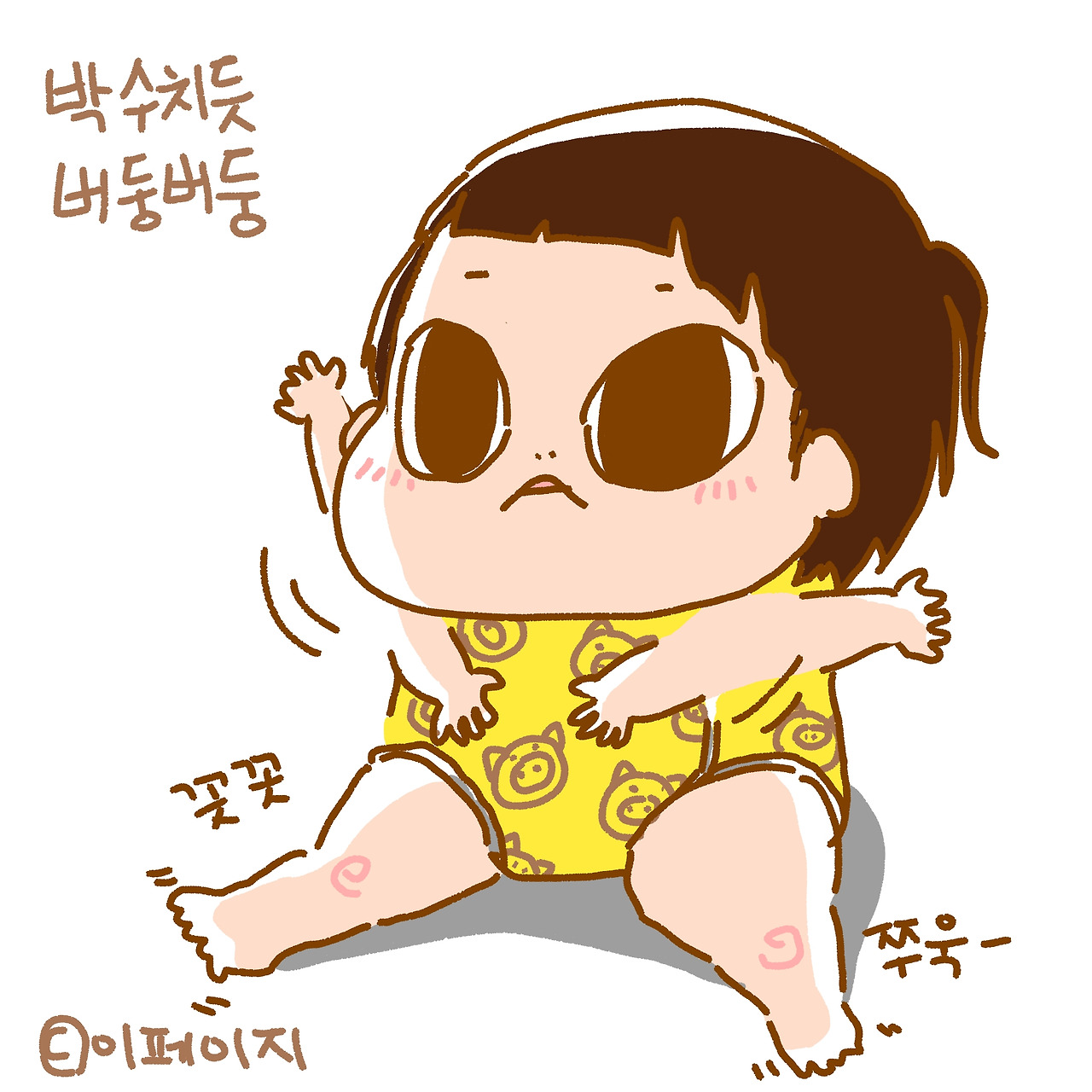 다인이는 할머니 보는 앞에서 벽 잡고 일어서기도 하고 다리를 세워 네발로 기는 모습도 보여드렸어. 그러더니 풀썩 주저앉아 장난감을 잠시 가지고 놀았지. 할머니는 그 모습을 보고 신나서 잘한다 잘한다~ 흥얼거리셨는데 그 박자에 맞춰 다인이가 팔을 바둥바둥 움직였어. 마치 박수를 치는 것처럼. 이 모습을 본 외할머니와 엄마는 또 한 번 흥분했어. 박수를 친다고! 세상에 이렇게나 뭔가 빨리 자라는 거냐고! 이번에도 두 번은 안 하더라. 전화를 마치고 아빠에게 가서 박수를 쳐보라고 했더니 어리둥절한 표정으로 쳐다보더라고.