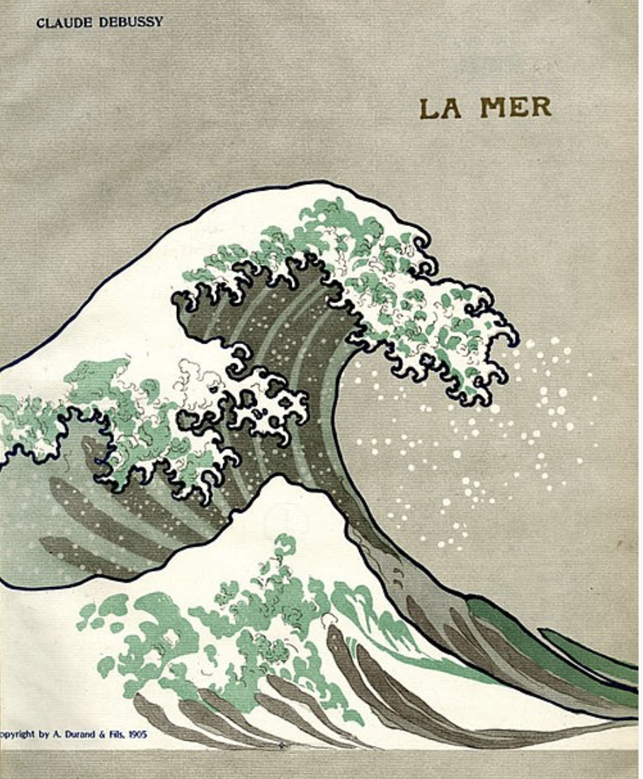 드뷔시는 1905년 출판된 <바다> (La Mer)의 초판 악보 표지에 일본의 목판화 작가 가쓰시카 호쿠사이의 <가나가와 해변의 높은 파도 아래>를 사용했다. 이를 통해 이 작품이 어디에서 영감을 받았는지를 분명히 보여준다. 호쿠사이의 파도가 보여주는 거대한 에너지와 자연의 위엄처럼, 드뷔시의 <바다> 역시 거센 파도의 움직임과 바다의 신비로움을 음악으로 생생하게 형상화한 작품이다.