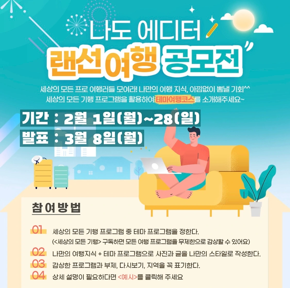 최근 마음속에 오래 품고 있었던 곳으로의 여행을 준비하고 있던 와중 문득 떠오른 기억이 있었으니, 그건 바로 무려 4년 전 2021년에 참여했던 제1회 EBS <나도 에디터! 랜선 여행 공모전>. 여행과 관련된 콘텐츠들을 좋아하기에 EBS '세상의 모든 기행' 프로그램들 또한 나의 최애 프로그램이다. 어느 날, EBS 블로그에 '랜선여행기 공모전'의 공지가 뜬 것을 보고 열혈 시청자로서 놓칠 수 없어 열심히 썼는데 감사하게도 상까지 받을 수 있었던 (나에게) 엄청났던 사건을 브런치에 추억으로 남겨두고자 한다.