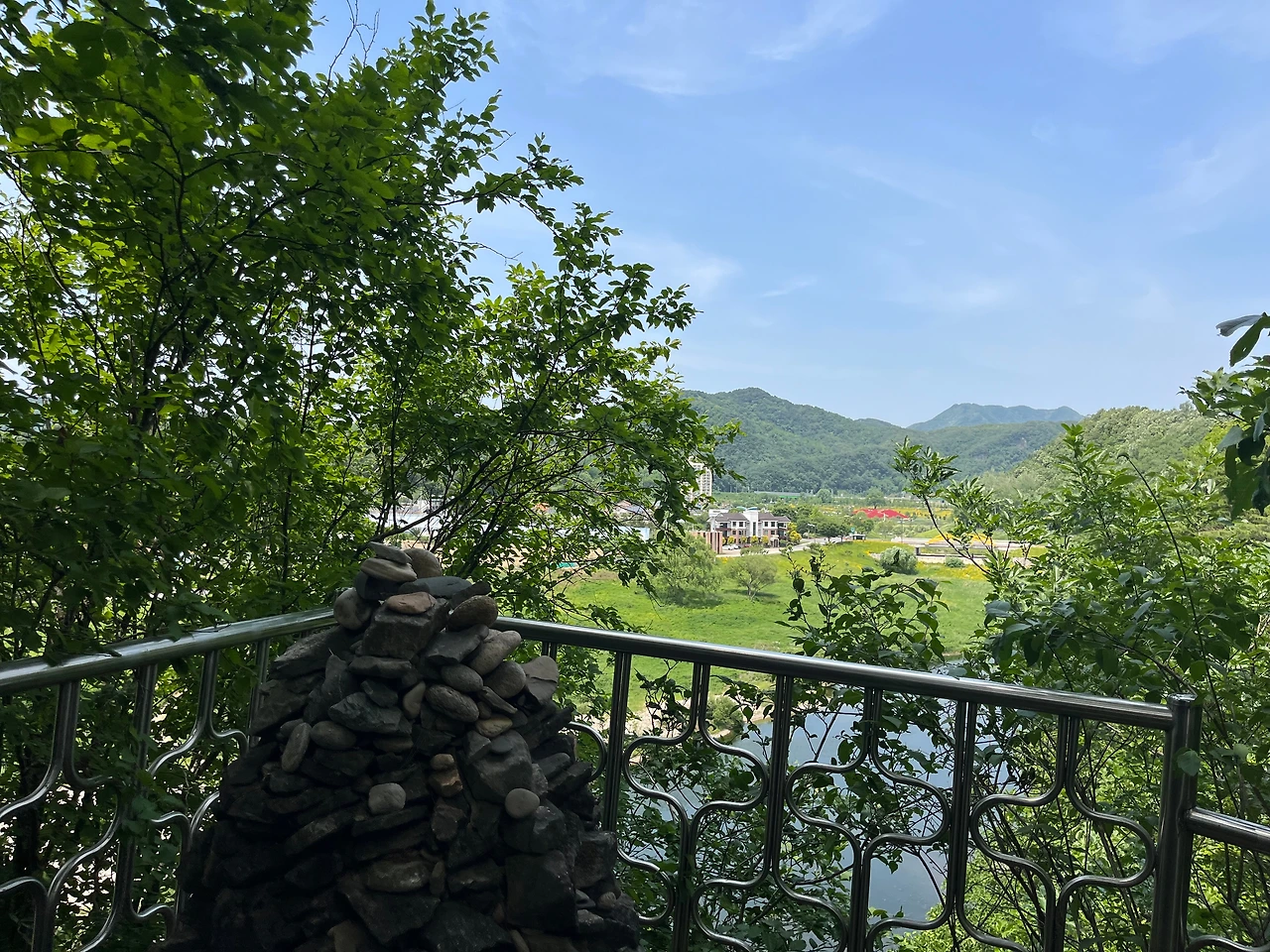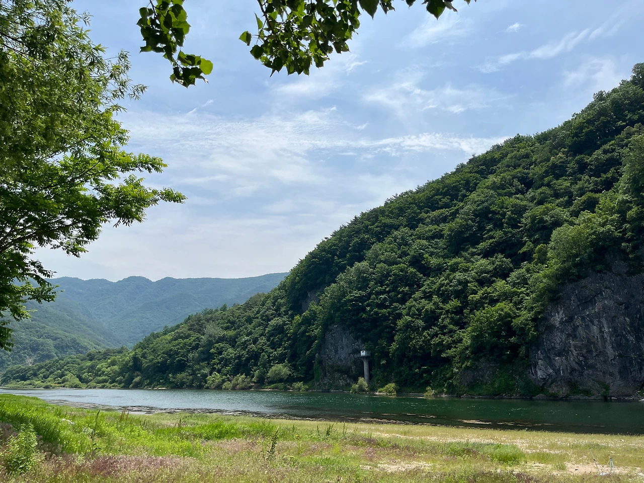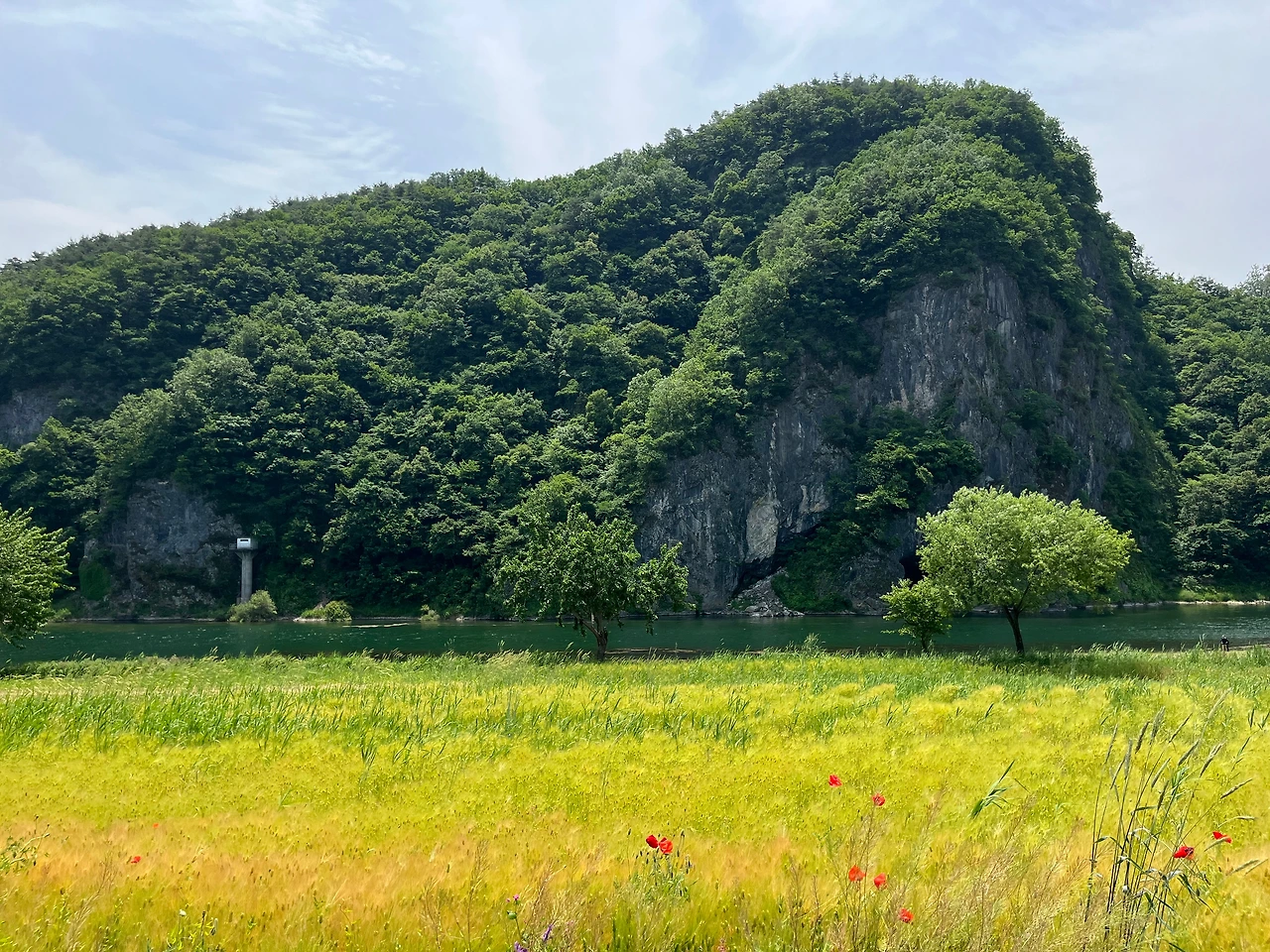 아침 일찍 출발해 도착한 강원도 영월, 처음으로 찾아간 장소는 영월 동강 목골쉼터. 봄에는 청보리와 꽃양귀비, 가을에는 붉은 메밀과 코스모스로 유명한 곳이다. 우리가 갔던 6월에는 청보리가 조금씩 올라오던 시기로 동강의 푸르름과 참 잘 어울렸던 곳이다. 붉은 메밀꽃으로 더 유명한 곳이라 그런가, 우리가 갔을 때는 사람들이 많이 없어 고즈넉함을 느낄 수 있어 너무나도 좋았던 곳이었다. 동강 뒤로는 바위산이 우뚝 서있었는데, 그 옆에 동굴은 무엇일까 궁금. 잔잔히 흐르는 동강의 물소리를 들으며 바라보는 목골마을의 풍경이 너무나도 아름다워 가을에 붉은빛으로 변한다는 메밀꽃밭의 풍경은 어떨까 궁금해졌다.