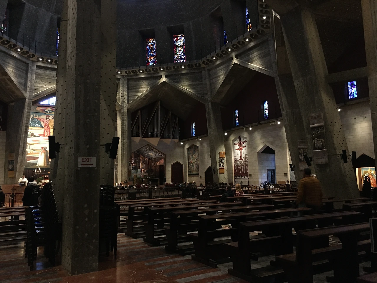 1층을 둘러본 후 마지막으로 올라가 본 2층은 수태고지 교회의 예배당으로 사용되고 있었다. 2층 예배당에서 바라본 지붕은 백합이 활짝 핀 모양으로 되어있었고, 그 모양이 예배당의 모습으로 이어지는 느낌이 들었는데 가톨릭에서는 백합이 성모 마리아를 상징한다고 하는 흥미로운 이야기. 예배당의 바닥 중앙에는 구멍이 뚫려있어 우리가 방금 보고 온 수태고지 동굴의 모습을 볼 수 있었고, 화려하고 거대한 모자이크 작품들이 제대 뒤부터 시작하여 예배당의 벽에 전시되어 있었다. 교회 뜰 안에 전시된 작품보다 뭔가 더 알록달록해서 눈을 뗄 수 없었던 예배당 내부의 모자이크 작품들까지 눈에 담으며 예배당 구경을 마무리했다.