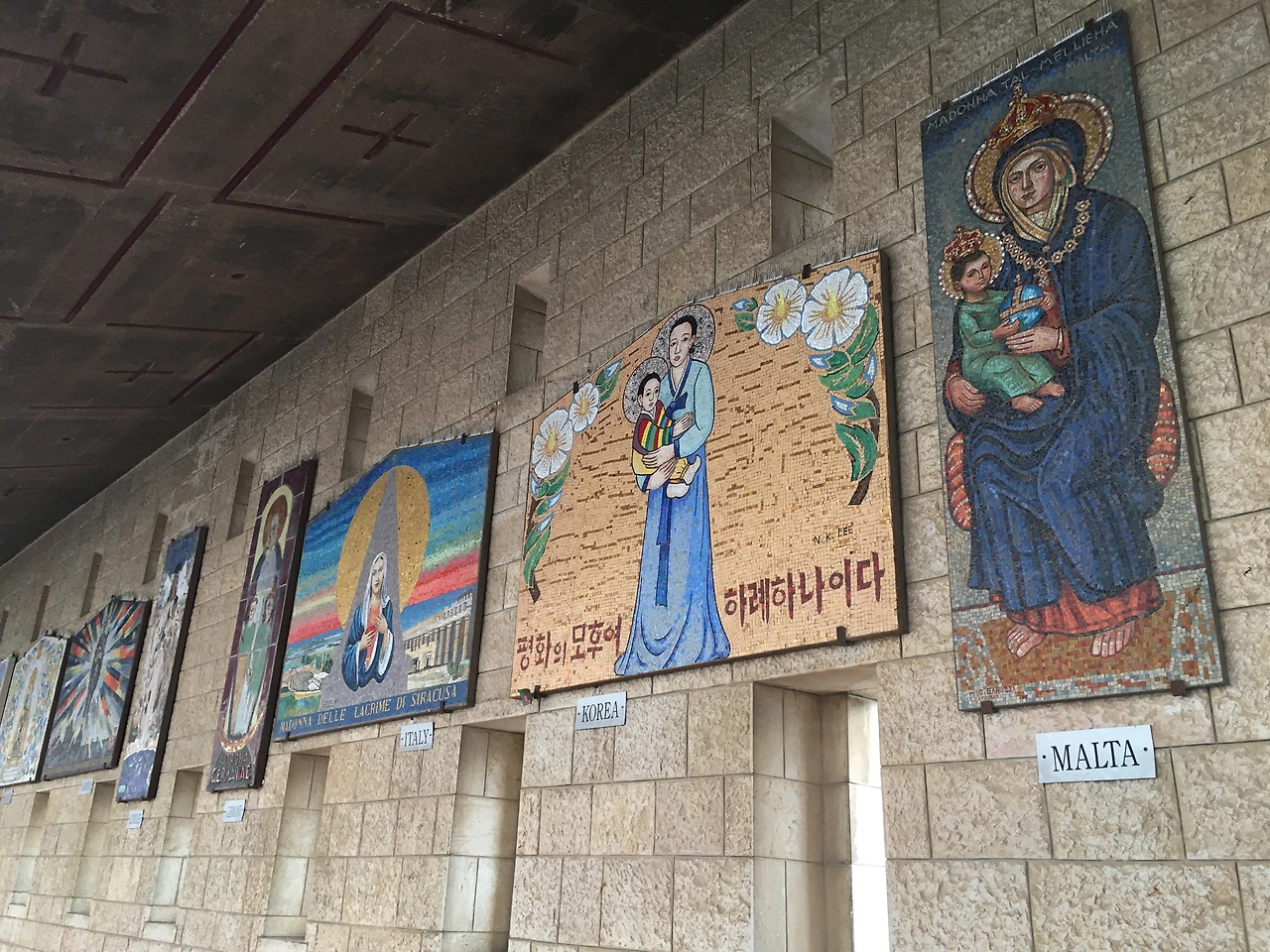 나사렛 수태고지 교회 안으로 들어가니 교회의 뜰 안에 전시되어 있는 여러 나라 복장을 한 마리아와 예수님의 모자이크 그림을 만날 수 있었다. 전 세계에서 만들어진 작품답게 마리아와 예수님이 각 나라의 전통 복장을 입기도 하고 각자 그림체가 달라서 보는 재미가 있었는데, 그래도 역시 나에게 가장 예뻤던 작품은 우리나라 작품. 우리나라 작품은 한복을 입은 마리아와 색동저고리를 입은 예수님, 그리고 주변의 무궁화로 꾸며진 모자이크 작품이었다. 수태고지 교회에 도착한 시간이 늦은 오후였기에 작품들을 빠르게 둘러본 후 바로 교회로 입장했다.