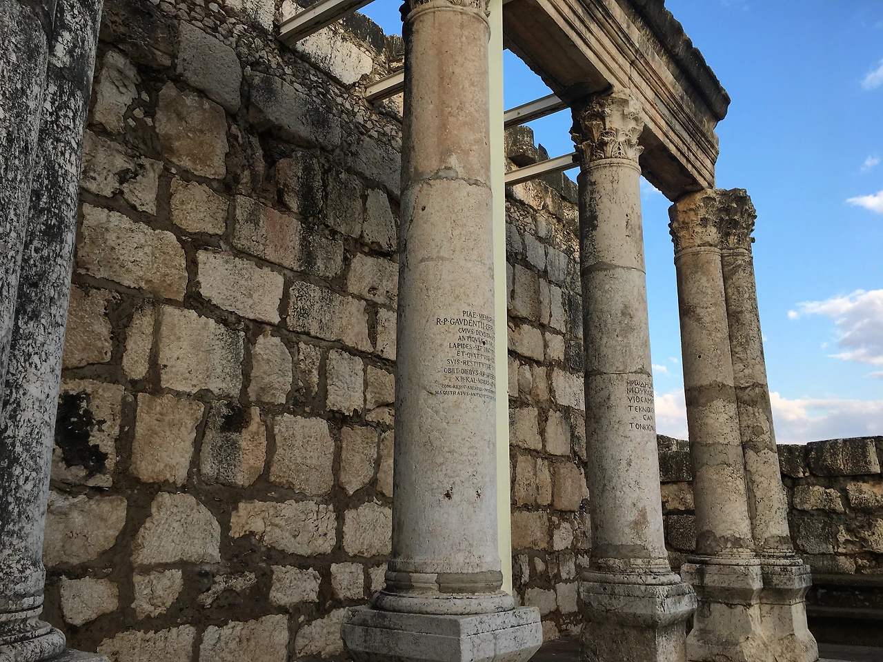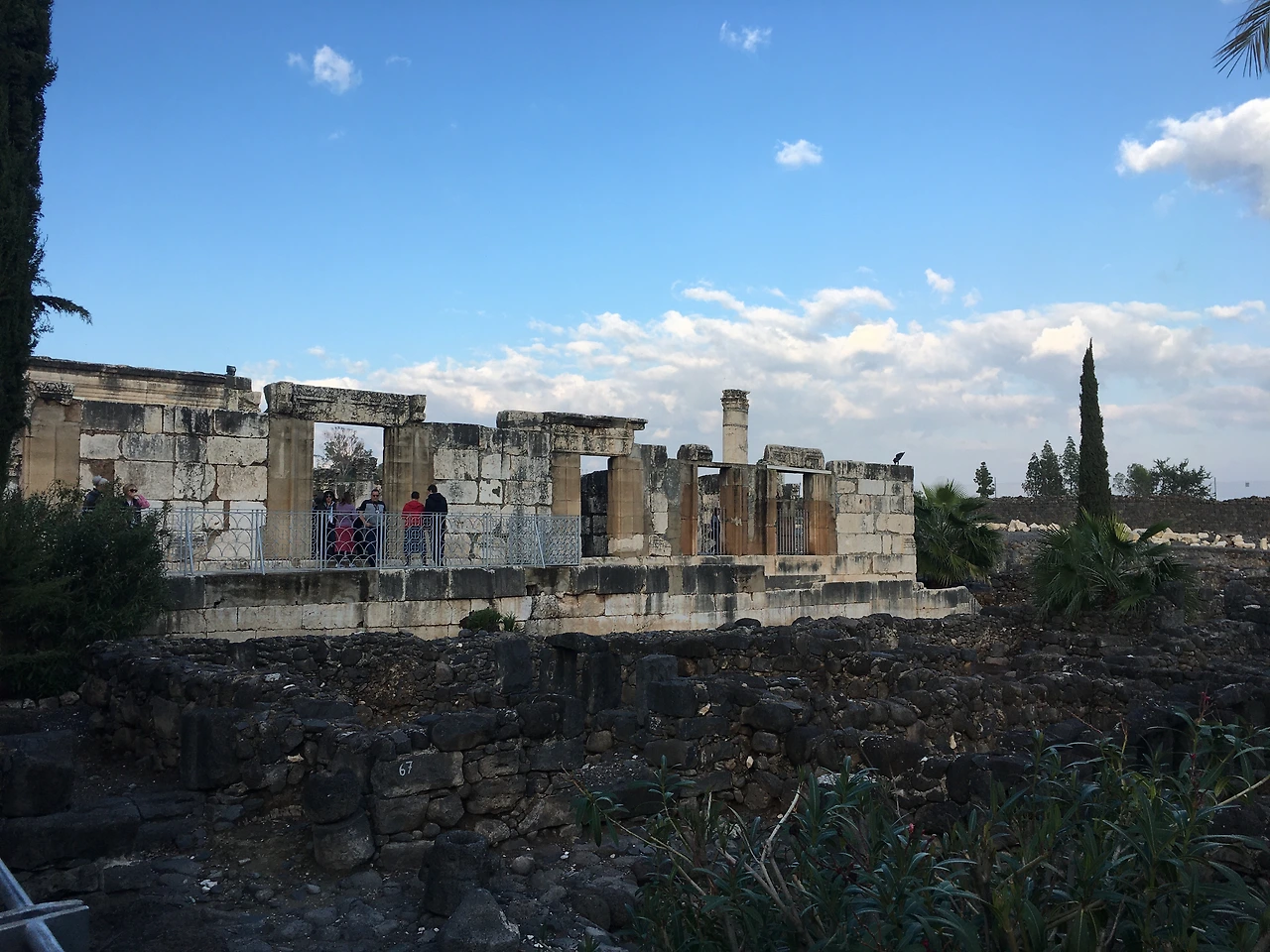 가버나움의 회당에서 예수님은 안식일마다 사람들을 가르치셨고, 또 권능을 통해 기적을 행하셨다. 현재 남아있는 유적은 4~5세기 경에 다시 지어진 유대인 회당 건물로 로마 시대의 대표적인 코린트 양식으로 되어있는 기둥에는 그리스어와 아람어 등 다양한 언어로 글자들이 새겨져 있었다. 흥미로운 사실 한 가지, 이곳은 검은 현무암이 흔한 곳이라 1세기 건축만 봐도 검은 현무함으로 되어있는 것을 볼 수 있는데 4~5세기에 회당을 다시 지을 때는 종교적 상징성을 시각적으로 나타내기 위해 멀리서 흰색 석회암을 가져와 건축하였다고 한다.