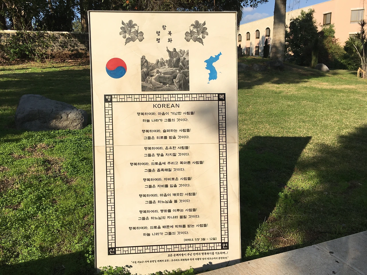 예배당을 나와 돌아보는 팔복기념교회의 정원 안에는 전 세계 수많은 언어로 팔복비가 세워져 있었는데, 그중 한국어로 된 팔복비를 보니 한글과 태극기, 한반도 지도까지 하나도 안 반가운 것이 없었다. 팔복기념교회에 세워져 있는 팔복비는 한국 천주교회와 한국 가톨릭 성지 연구소에서 봉헌한 것이라 천주교 성경의 번역문으로 되어있었는데, 기독교 성경에 익숙해져 있는 나에게는 팔복 말씀이 또 다르게 다가왔다. 그렇게 팔복기념교회 정원을 한 바퀴 돌아본 후, 기념품샵에 들러 엽서를 잔뜩 구매하는 것으로 교회 구경을 마무리했다.