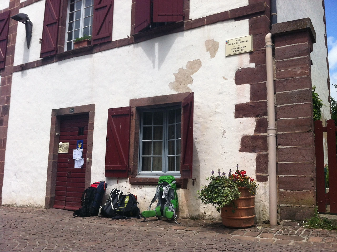 나와 언니가 고른 우리의 첫 알베르게는 ‘55번 공립 알베르게’로 유명한 알베르게! 늘 인기가 많아 자리가 없을 수도 있다고 하는데 생장에 너무 늦게 도착하지 않아 무사히 알베르게에 체크인을 할 수 있었다. 짐을 풀고 샤워를 한 후, 야간버스의 피곤함을 풀기 위해 낮잠을 조금 즐긴 후 본격적으로 마을 구경하러 출발! 알베르게에서 생겼었던 웃픈 일 하나. 언니가 샤워 후에 침대 옆에 한국에서 가져온 때밀이타월을 말리려고 걸어놨었는데 그것이 감쪽같이 사라졌다. 때밀이타월을 누가 가져갔는지 끝까지 알아내지 못했기에 언니는 산티아고를 걷는 내내 시원하게(?) 씻지 못했다는 후문.