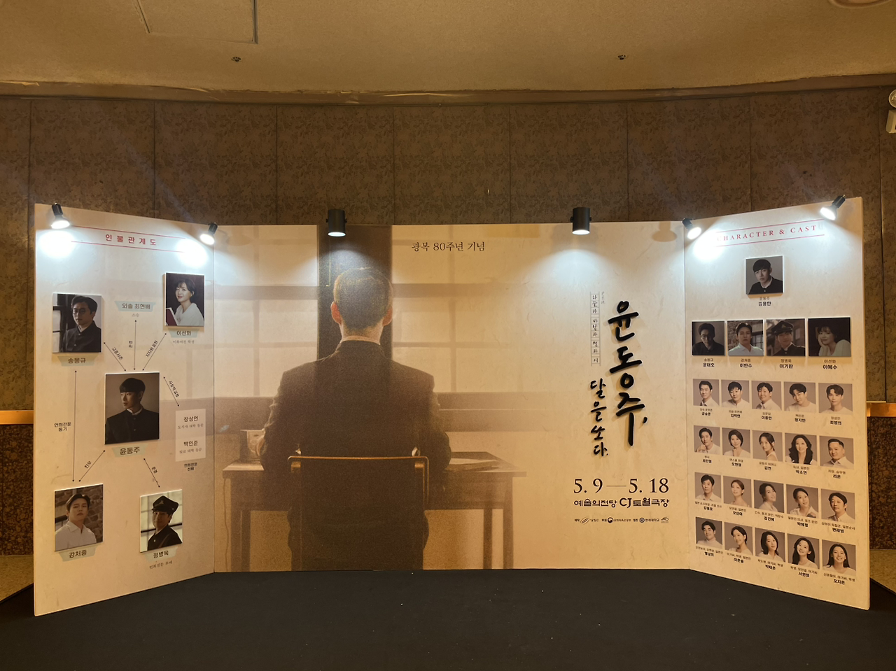 창작가무극 <윤동주, 달을 쏘다.> 오늘의 캐스트 보드. 이번 2025년 칠연에 만나는 ’윤동주‘는 김용한 배우가 맡았는데, 김용한 배우는 예전에 뮤지컬 <화랑>에서 기파랑 역으로 만났었던 적이 있다. 그날 뮤지컬을 보고 돌아가는 지하철에서 우연히 만났었는데, 짧게 대화도 나누고 같이 사진도 찍었었던 좋은 기억이 있어 그 후 다른 작품에 이름이 보이면 응원하고는 했었다. 또 다른 주요 역할인 송몽규, 강처중, 정병욱, 이선화 역을 맡은 배우분들은 처음 뵙는 배우 분들로 서울예술단의 단원분들이라고 한다.
