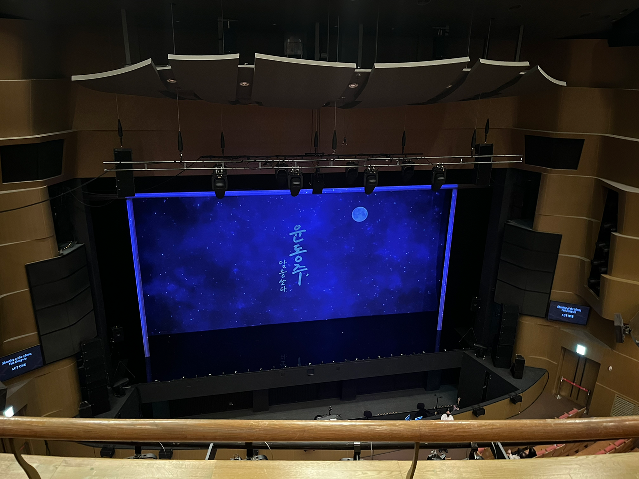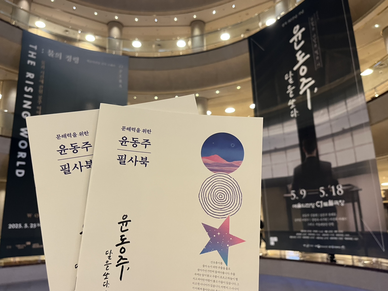 이번 <윤동주, 달을 쏘다.>에서는 모든 관람객들에게 윤동주 시인의 작품이 담긴 ’시와 산문 10편 필사북‘을 증정했는데, 공연에서 나오는 작품들로 되어있어 공연 전 작품들을 읽어볼 수 있어 좋았다. 또한 온라인 프로그램북을 다운로드하여 읽을 수 있도록 해주었는데, 덕분에 극의 흐름을 따라가기 좋았다. 프로그램북에서 읽은 내용들이 무대에서는 어떻게 표현될지 설레는 마음을 가지고 극장 입장.