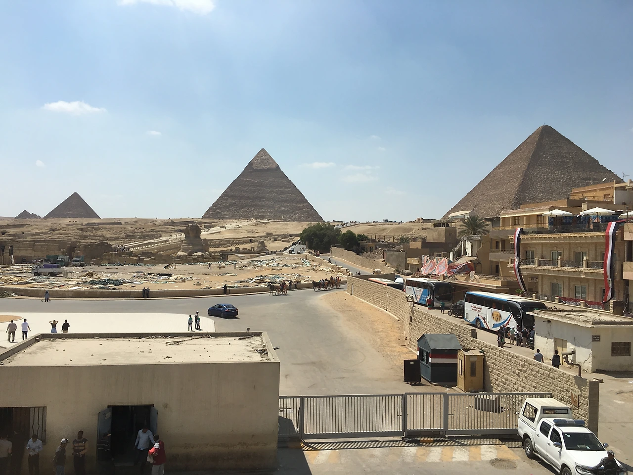 기자 대피라미드 구경을 마치고, 이집트를 여행했거나 검색해 본 사람이라면 다 알고 있을 그곳으로 향했다. 바로 기자 대피라미드를 한눈에 담을 수 있는 풍경 맛집, 피자헛. 기자 피라미드 바로 앞에 위치하고 있어 점심도 먹을 겸 겸사겸사 가본 피자헛은 역시 피라미드 세 개와 스핑크스를 한눈에 담을 수 있는 명당이었다. 사실 옥상에 올라가면 더 사진이 잘 나온다고 했는데, 이미 더위에 지쳐버린 우리들은 3층 창문으로 바라보는 풍경으로 만족하며 피자로 배를 채웠다.