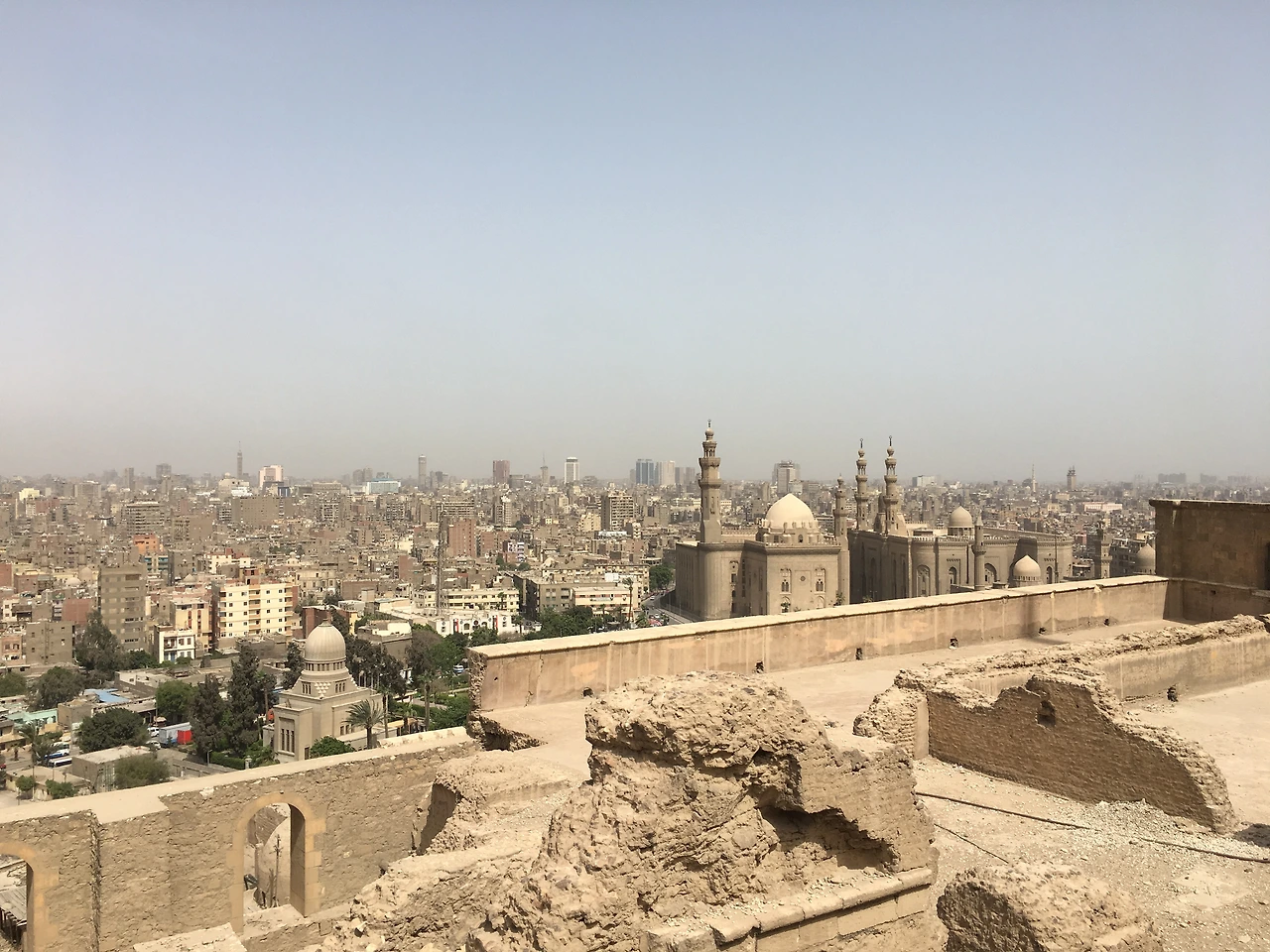 시타델 전망대에 올라서니 한눈에 들어오는 카이로의 전경. 높은 곳에서 보는 카이로의 풍경과 기자 피라미드의 모습을 볼 수 있기를 기대했는데, 먼지와 매연 등으로 인해 멀리 볼 수 없었다. 해가 나왔던 화창한 날이었는데도 불구하고 카이로는 본인의 별명답게 뿌연 회색 도시의 모습을 보여주었다. 약간의 아쉬움을 뒤로한 채 동행님들 찬스로 카이로의 전경을 배경으로 사진을 남겼다. 시타델에서 내려오는 길, 너무나 귀여운 장면을 목격했는데 바로 더위를 피해 그늘에 누워 잠자고 있던 강아지들! 강아지들의 귀여운 모습을 사진에 담은 후, 다음 목적지인 콥틱 카이로로 이동했다.