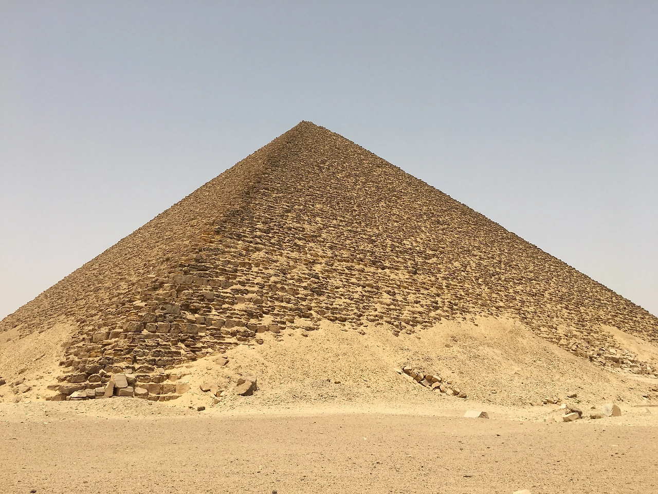 다음으로 보러 간 곳은 다슈르에 위치해 있는 붉은 피라미드 (Red Pyramid), 그리고 굴절 피라미드 (Bent Pyramid). 기자의 대피라미드보다는 작은 크기지만, 그래도 붉은 피라미드는 이집트에서 3번째로 큰 피라미드라고 한다. 이전 피라미드 방문기에서 말했지만, 내가 늘 상상해 왔던 피라미드는 어느 사막 한가운데 근엄하게(?) 서있는 모습이었다. 그래서 기자 대피라미드를 마주했을 때, 내 상상과는 다르게 시내에 위치하고 있어 뭔가 아쉬운 느낌이 있었다. 나의 아쉬움을 알았는지, 상상 그대로 서있던 다슈르의 피라미드. 그리고 이곳의 피라미드가 특별했던 또 하나의 이유가 있는데, 바로 피라미드의 내부를 볼 수 있었기 때문이었다.