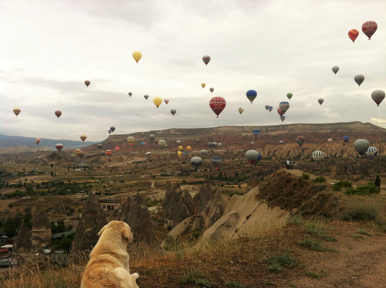 쌀쌀한 새벽공기를 맞으며 전날 미리 인터넷에서 찾아놓은 카파도키아 벌룬투어 뷰포인트 도착! 사실 몇 시가 적당한 시간인지 몰라서 벌룬투어를 하는 사람들과 같은 시간에 일어난 터라, 너무 일찍 도착했는지 아직 열기구들은 준비 중이었다. 이른 시간이라 뷰포인트에 아직 아무도 와있지 않아 외로울 뻔했지만, 함께 기다려준 갱얼지 친구 덕분에 외롭지 않았던 시간. 그렇게 길었던 기다림의 시간이 지나고, 하나씩 떠오르는 열기구들과 카파도키아의 풍경이 너무나 아름다워 시간 가는 줄 모르고 한참을 앉아 구경했다.