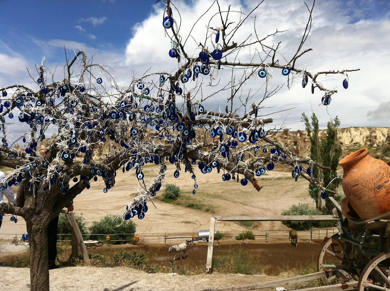 카파도키아를 구경하며 다양한 모양의 바위들만큼이나 많이 만날 수 있던 것은 쨍한 파란색 구슬 ‘악마의 눈’. 튀르키예어 이름은 나자르 본주 (Nazar Boncuğu)라는 이 악마의 눈은 튀르키예 사람들에게는 악귀를 쫓아내고 행운을 가져다주는 부적 같은 구슬이라고 한다. 나무에 주렁주렁 매달려 있던 나자르 본주들이 행운을 가져다주는 아타이 파노라마 방문을 마지막으로 괴레메 반나절 투어가 마무리.