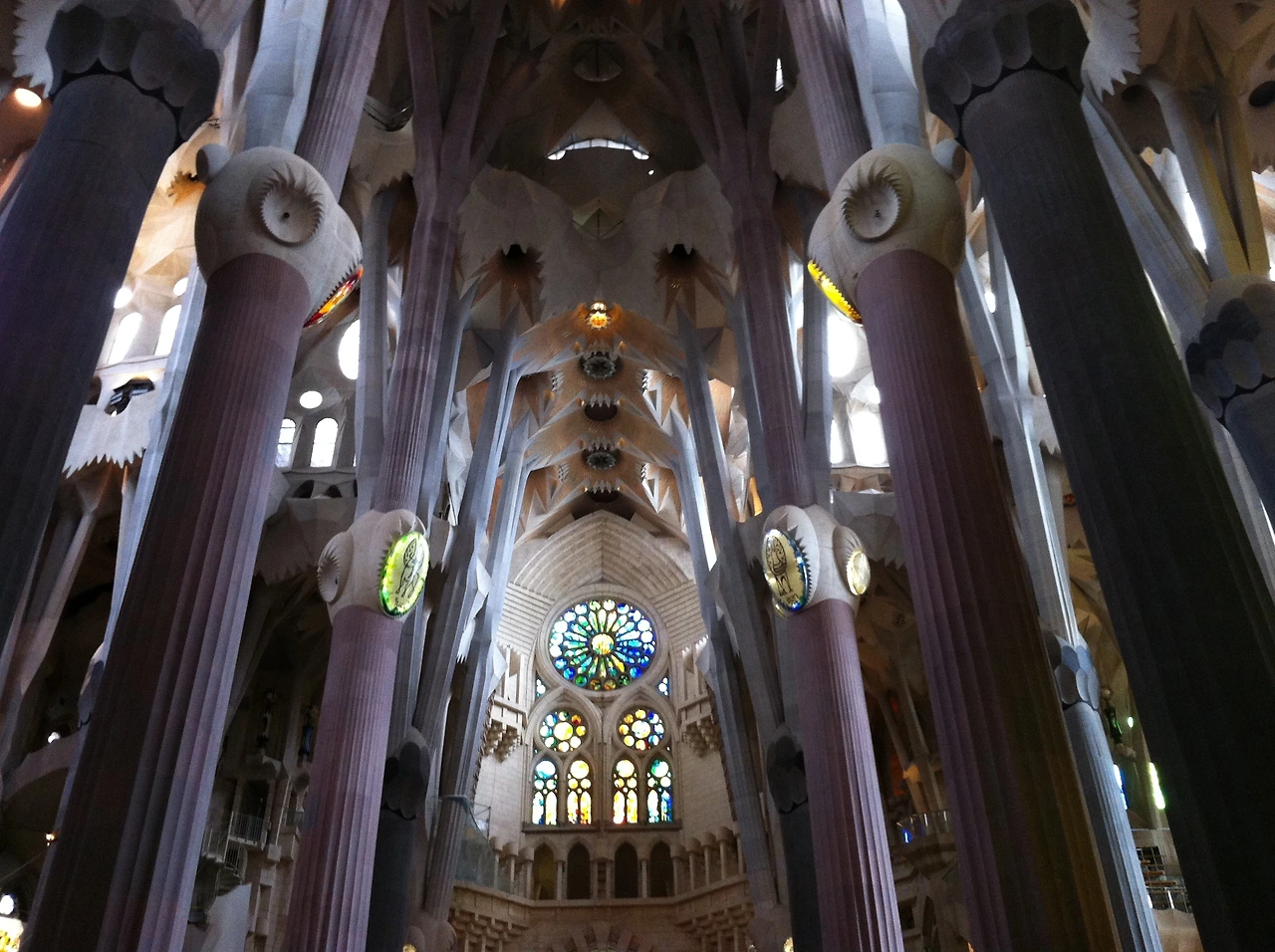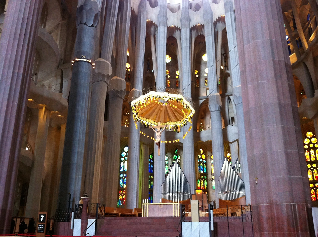 사그라다 파밀리아 대성당 구경을 다 마치고 마지막으로 중앙 제단 앞에 있는 의자에 앉아서 바라본 대성당의 중심. 중앙 제단 위에는 예수 그리스도의 십자가 상이 있고, 제단을 둘러싼 색이 다른 4개의 기둥이 있는데 자주색의 이 기둥은 네 명의 사도를 나타낸다고 한다. 어느 것 하나 의미 없이 배치해 놓은 것이 없는 가우디의 역작.