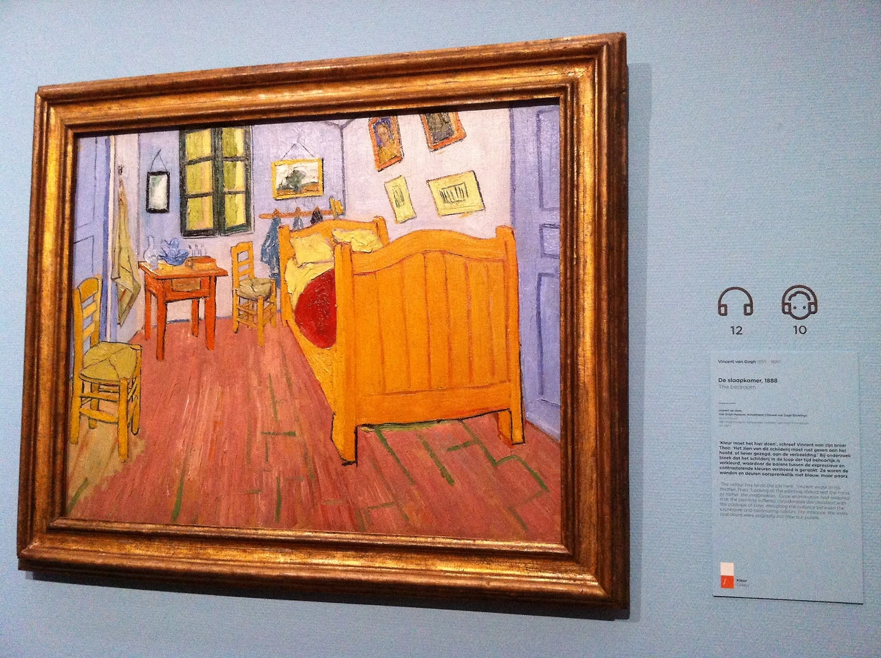 1888년 작품, <아를의 방> (De Slaapkamer, The Bedroom). 아를의 '노란 집'으로 알려져 있는 고흐가 살았던 2층의 방을 그린 이 작품은 총 세 가지 버전이 있는데, 반 고흐 미술관에 걸려있는 그림은 첫 번째 버전이다.