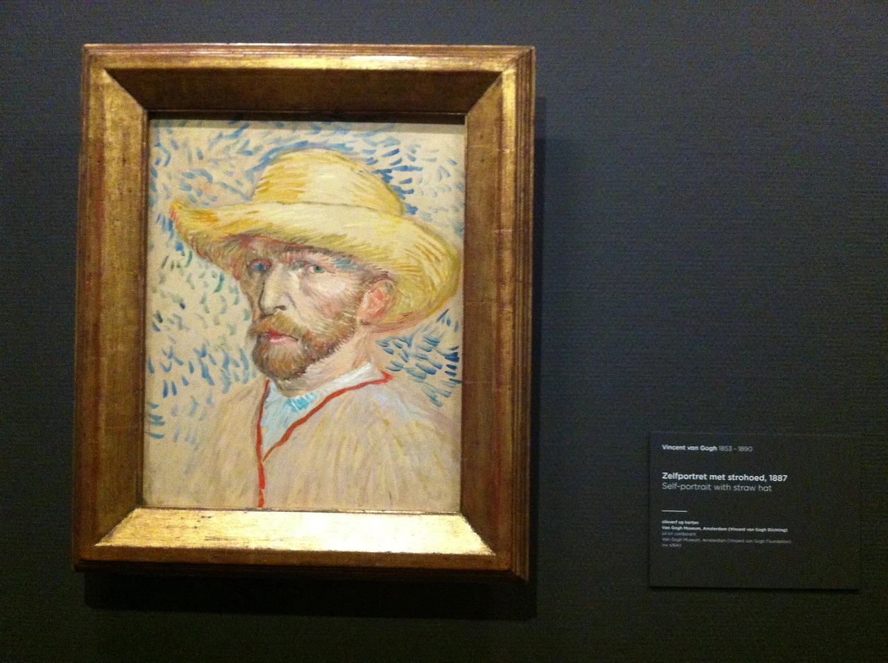 1887년 작품, 파리에서 지내던 여름에 그린 <밀짚모자를 쓴 자화상> (Zelfportret met Strohoed, Self-Portrait with Straw Hat). 모델을 살 돈이 없어서 본인을 모델로 자화상을 많이 남긴 반 고흐. 특히 이 작품은 돈이 없어 캔버스가 아닌 마분지에 유화로 올린 그림인데, 저렴한 물감을 사용했기에 주변의 색이 많이 증발되었다고 한다.