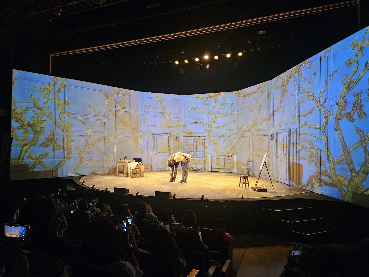 자신의 가장 연약한 부분까지도 나누는 형 고흐, 그리고 그 모든 것을 품어주는 동생 테오. 이런 형제가 어디 있을까. 그렇게 고흐의 처절했던 삶의 이야기가 지나가고 마지막 고흐의 유작 <까마귀가 나는 밀밭> 그림이 무대에 가득 차며, "좋아, 완벽해"라는 대사를 마지막으로 무대 밑의 총성으로 뮤지컬이 끝난다. 그 순간의 총성에 심장이 철렁하고 고흐가 느꼈을 마지막 감정까지 확 다가오는듯해 숨이 턱 하고 막히는 기분. 그래도 이후 커튼콜에서 '삼촌' 빈센트가 '조카' 빈센트에게 주는 선물 <꽃피는 아몬드 나무> 그림 속 흩날리는 아몬드꽃 아래 행복한 형제의 모습 덕분에 뭉클한 마음으로 마무리할 수 있었다. 홍승안, 박좌헌 배우는 이번 뮤지컬로 처음 만나는 배우들이었는데, 너무 고흐와 테오 그 자체여서 바로 팬이 되어버리고 말았다고 한다.