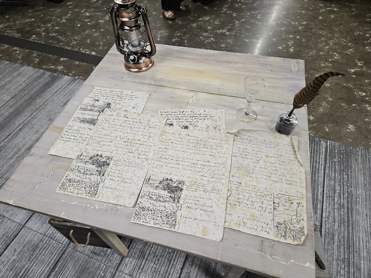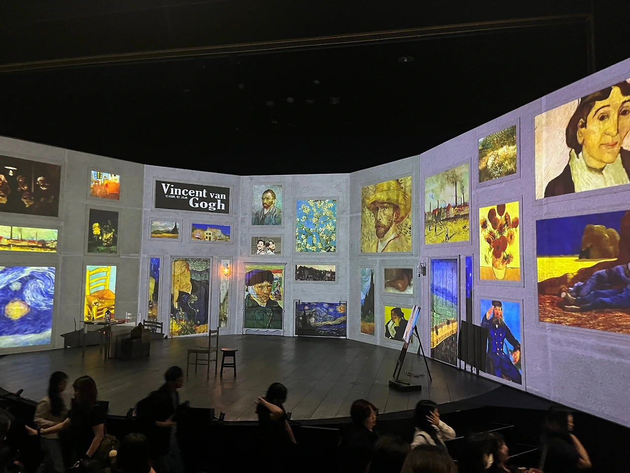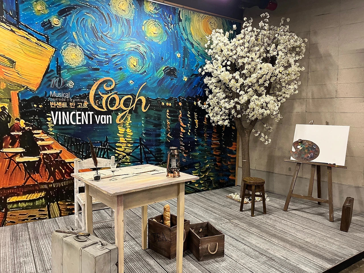 하루 종일 주룩주룩 비가 오던 날, 열심히 뮤지컬 <빈센트 반 고흐>를 보기 위해 찾아간 서경스퀘어 스콘 1관. 공연장에 도착해서 표를 받고 설레는 마음으로 이곳저곳을 둘러보는데 너무나도 나의 취향을 저격하는 포토존이 눈에 들어왔다. 고흐가 사용했을 것만 같은 캔버스와 이젤, 아를 방에 있었을 테이블과 의자, 꽃이 핀 아몬드나무까지. 뮤지컬을 보러 갈 때면 보통 포토존만 찍곤 하는데, 이곳은 내가 포토존에 들어가 사진을 찍었던 몇 안 되는 곳.