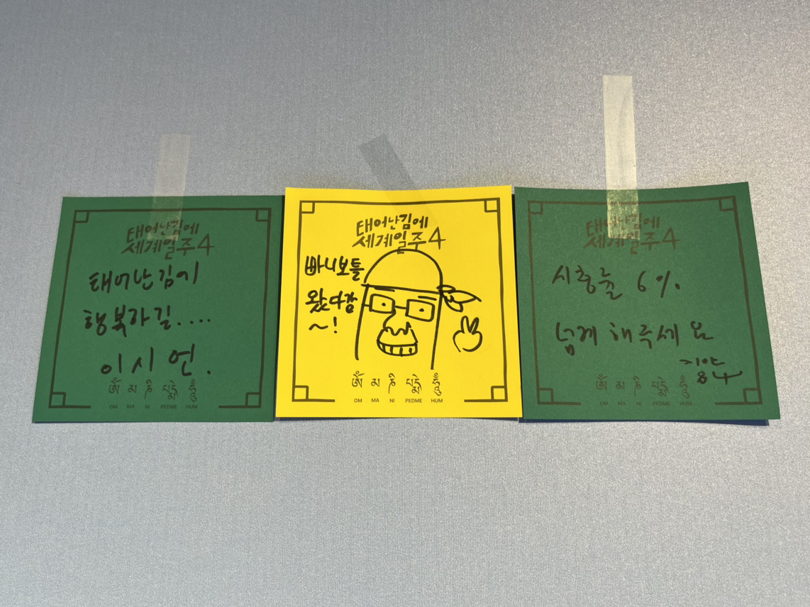 굿즈까지 알차게 구매하고 마지막으로 응원 메시지 남기러 갔다. 포스트잇이 오색 깃발 색인 센스! 이미 팝업스토어에 방문한 이시언, 기안84, 빠니보틀의 메시지를 볼 수 있었는데 세 명 각자의 특색이 잘 드러나는 메시지를 구경하는 재미가 쏠쏠했다. 여러 가지 색깔의 포스트잇 중 빨간색으로 골라 응원 메시지를 짧게 남기며 팝업스토어 구경을 마무리했다.