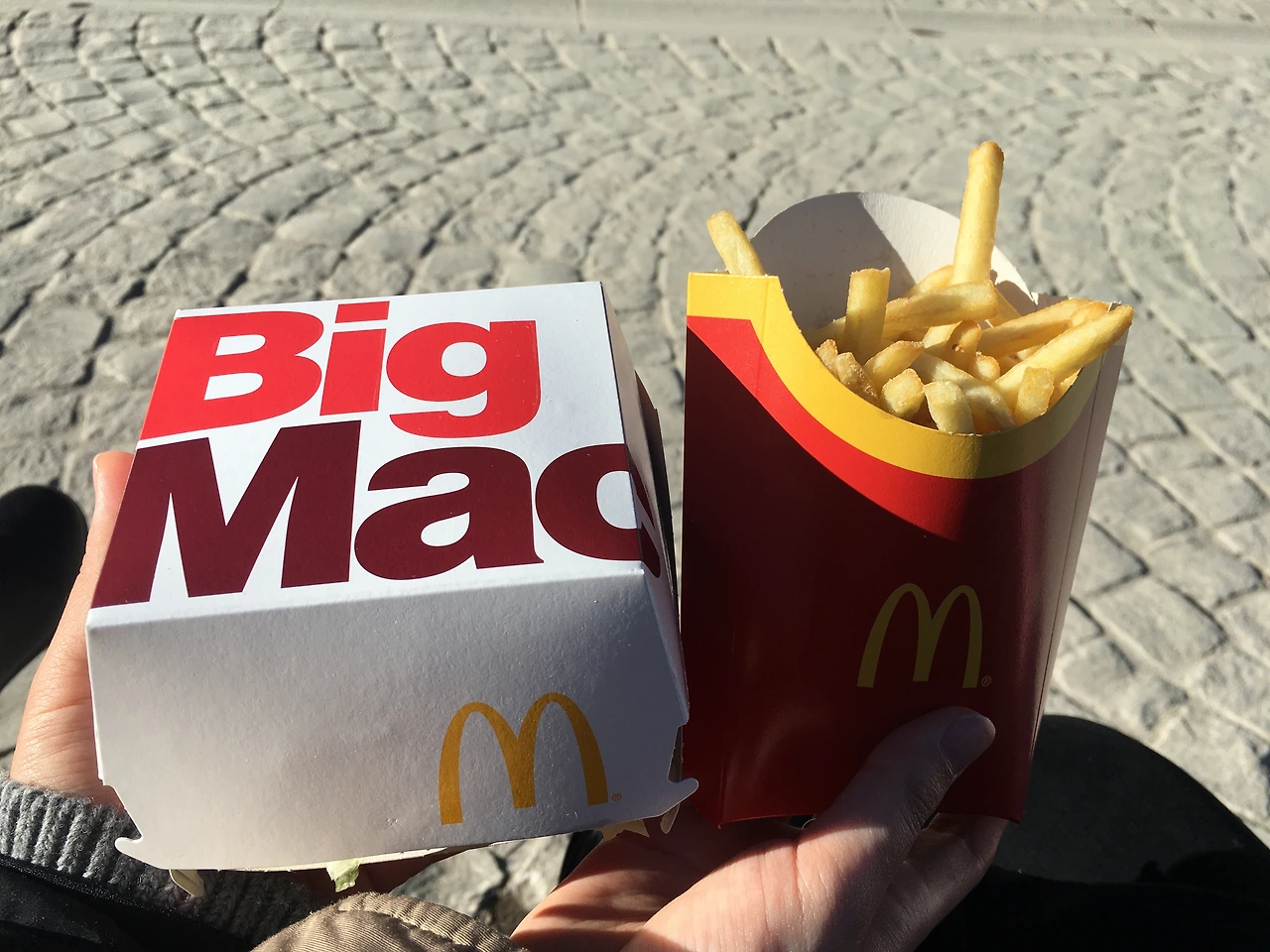 스위스 체르마트에서의 점심을 무엇을 먹을까 고민하다가 결정한 메뉴는 바로 맥도널드 빅맥! 빅맥은 전 세계 각국의 맥도널드의 빅맥 가격을 달러로 환산하여 물가를 비교하는 '빅맥 지수'로 널리 알려져 있는데, 특히 스위스의 빅맥지수는 세계에서 가장 높은 수준으로 악명이 높다. 궁금해진 우리들은 과감히 점심을 빅맥으로 먹기로 결정! 상쾌한 공기가 너무 좋아서 밖에서 먹기로 하고, 빅맥과 감자튀김을 테이크아웃 해서 밖으로 나왔다. 기대되는 마음으로 맛본 스위스산 빅맥은 그냥 내가 알고 있는 그 빅맥 맛이었고, 악명 높은 가격은 스위스 물가가 워낙 비싸다 보니 오히려 저렴하게 보이기까지 했다.