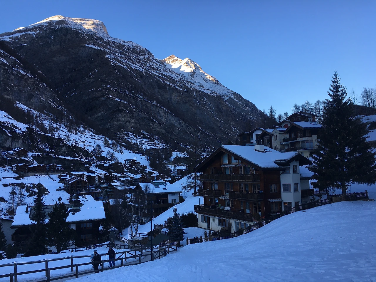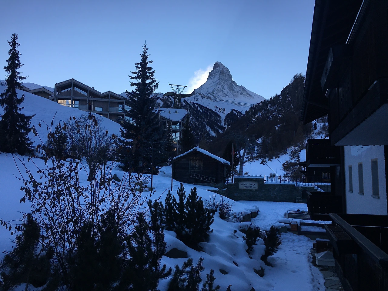마을로 향하는 길, 어둠이 약간 내렸음에도 우뚝 서있는 마터호른의 존재감. 마터호른을 가까이서 만나기 위해서는 해발 약 3,000미터의 고르너그라트행 산악기차를 타고 약 30분 정도 올라가야 한다. 이렇게 멋진 마터호른의 자태를 보니, 사실 도착한 날 갈까 고민하다가 다음날 가기로 했던 우리의 결정이 잠시 후회가 되었다. 그래도 도착한 날 청량한 하늘 아래 우리에게 아름다운 모습을 보여준 마터호른을 믿으며, 고르너그라트에 올라가 가까이서 만나기를 기대하며 후회는 넣어두었다. 그리고 설레는 마음으로 다음 날 만난 마터호른은… 우선 여기까지.