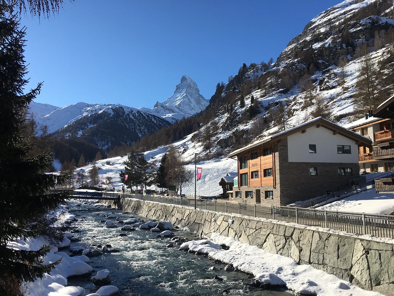 체르마트 기차역에서 나와 예쁜 거리를 걷다가 끝에서 마주한 주인공 마터호른 (Matterhorn). 뿔모양으로 예쁘게 깎인 마터호른은 3대가 덕을 쌓아야 볼 수 있다고 하는데, 이렇게 우리의 눈앞에 나타나주다니! 여행의 첫 시작에 구름 한 점 없이 청량한 하늘아래 마터호른을 보니 새벽에 출발해 약간 피곤했는데 피곤함이 싹 사라지는 기분. 마터호른을 눈에 열심히 담고, 아직 숙소 체크인 시간이 되지 않아 어디를 갈까 고민하다가 점심을 먹고 이동하기로 결정했다.